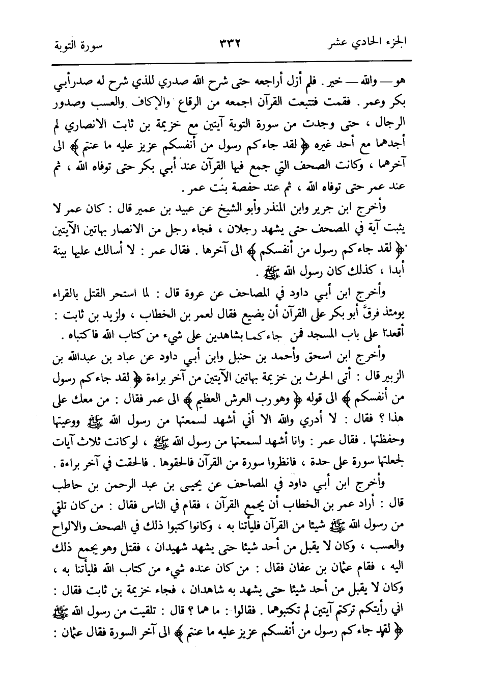 وَأخرج ابْن إِسْحَق وَأحمد بن حَنْبَل وَابْن أبي دَاوُد عَن عباد بن عبد الله بن الزبير قَالَ: أَتَى الْحَرْث بن خُزَيْمَة بِهَاتَيْنِ الْآيَتَيْنِ من آخر بَرَاءَة {لقد جَاءَكُم رَسُول من أَنفسكُم} إِلَى قَوْله {وَهُوَ رب الْعَرْش الْعَظِيم} إِلَى عمر فَقَالَ: من مَعَك على هَذَا فَقَالَ: لَا أَدْرِي وَالله إِلَّا أَنِّي أشهد لسمعتها من رَسُول الله صلى الله عَلَيْهِ وَسلم ووعيتها وحفظتها