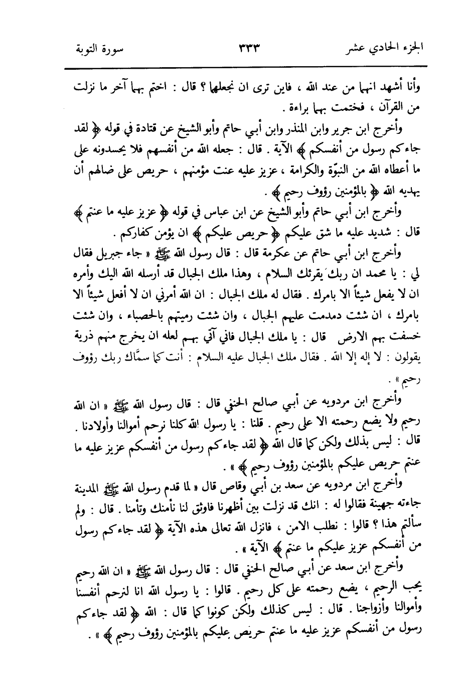 وَأخرج ابْن أبي حَاتِم وَأَبُو الشَّيْخ عَن ابْن عَبَّاس فِي قَوْله {عَزِيز عَلَيْهِ مَا عنتم} قَالَ: شَدِيد عَلَيْهِ مَا شقّ عَلَيْكُم {حَرِيص عَلَيْكُم} أَن يُؤمن كفاركم