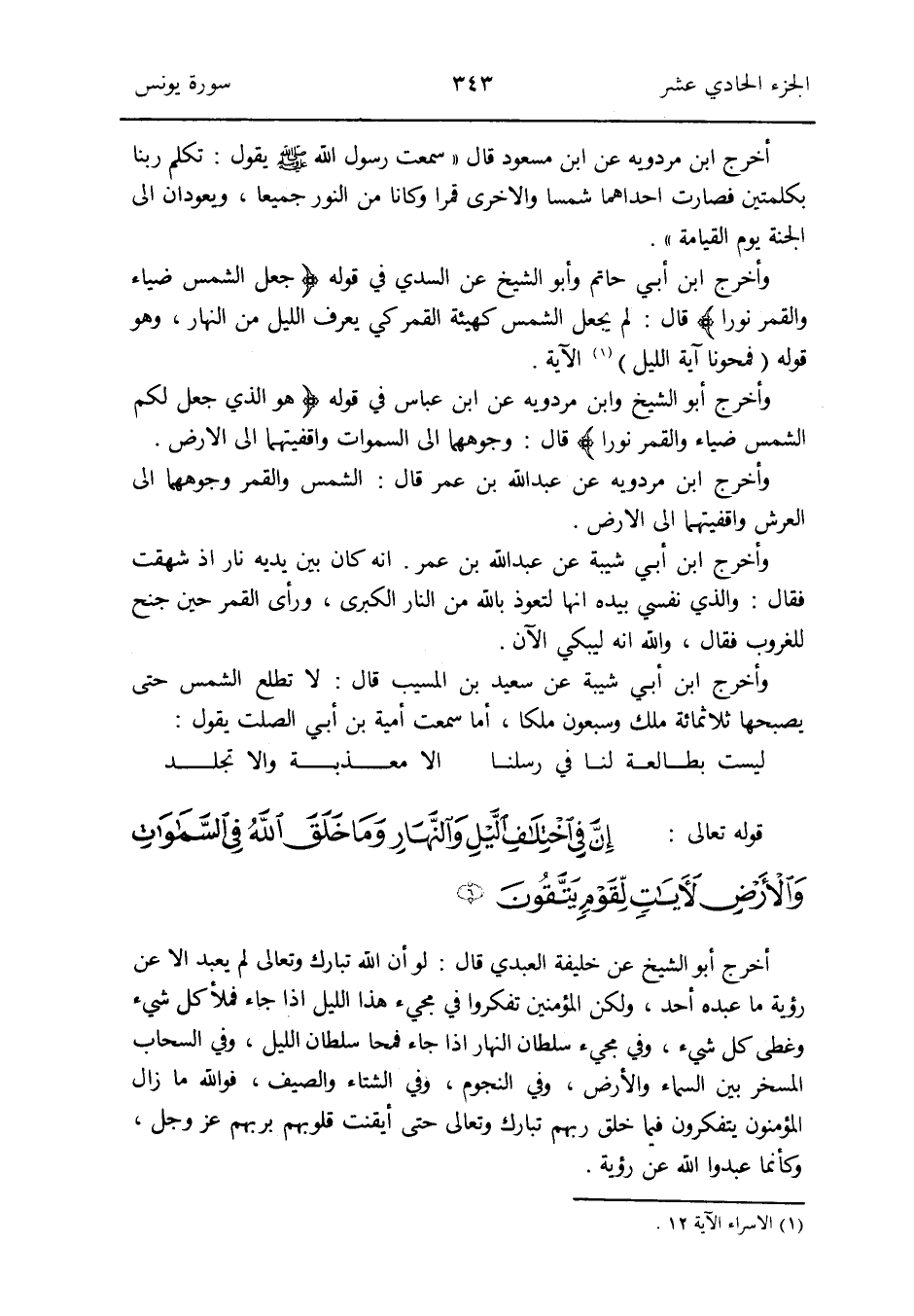 وَأخرج أَبُو الشَّيْخ وَابْن مرْدَوَيْه عَن ابْن عَبَّاس فِي قَوْله {هُوَ الَّذِي جعل الشَّمْس ضِيَاء وَالْقَمَر نورا} قَالَ: وُجُوههمَا إِلَى السَّمَوَات وَأَقْفِيَتهمَا إِلَى الأَرْض