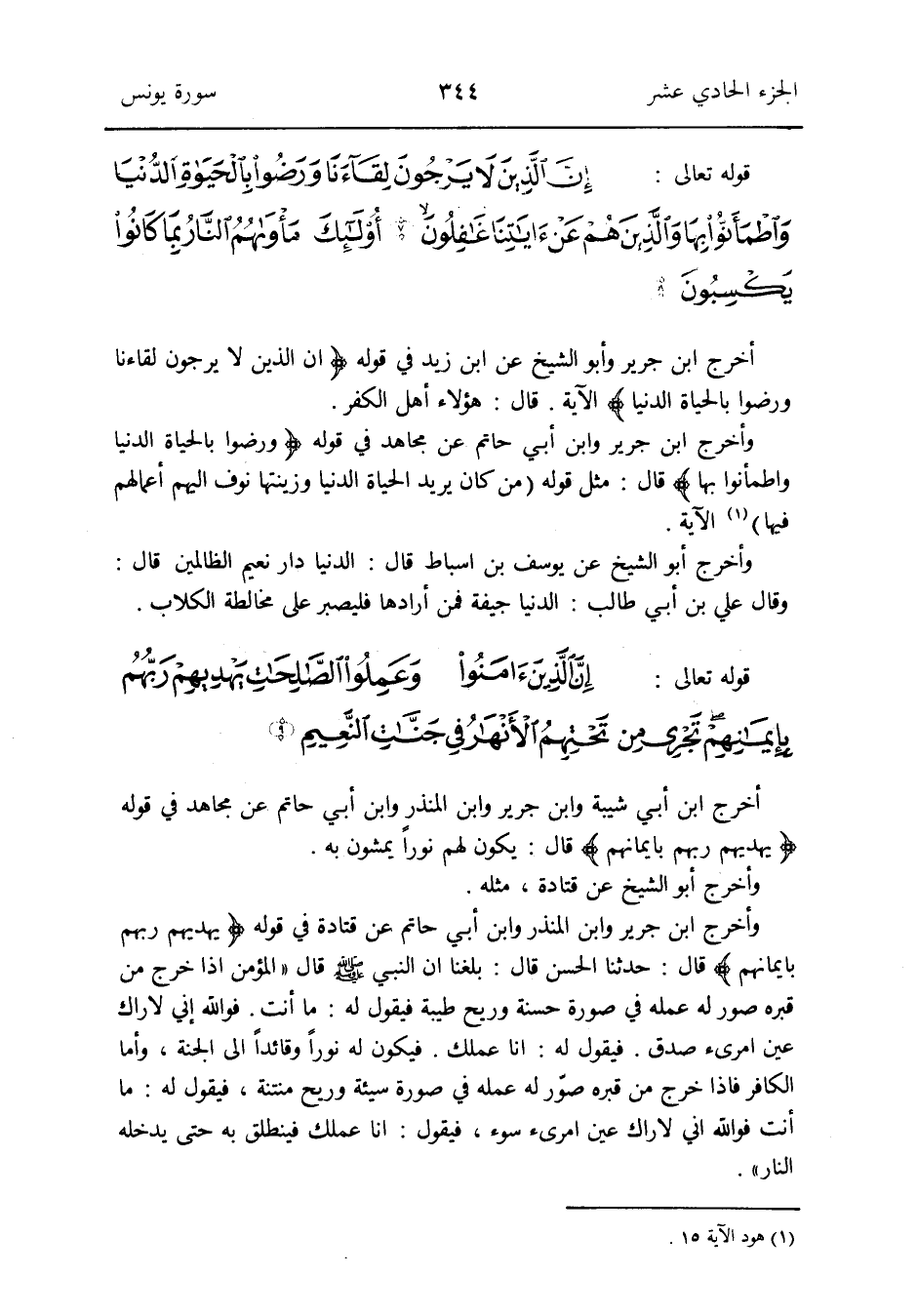 وَأخرج ابْن جرير وَابْن أبي حَاتِم عَن مُجَاهِد فِي قَوْله {وَرَضوا بِالْحَيَاةِ الدُّنْيَا واطمأنوا بهَا} قَالَ: مثل قَوْله (من كَانَ يُرِيد الْحَيَاة الدُّنْيَا وَزينتهَا نوف إِلَيْهِم أَعْمَالهم فِيهَا) (هود الْآيَة 15) الْآيَة