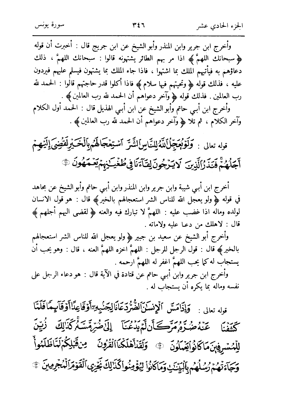 وَأخرج أَبُو الشَّيْخ عَن سعيد بن جُبَير {وَلَو يعجل الله للنَّاس الشَّرّ استعجالهم بِالْخَيرِ} قَالَ: قَول الرجل للرجل: اللهمَّ اخزه اللهمَّ العنه قَالَ: وَهُوَ يحب أَن يُسْتَجَاب لَهُ كَمَا يحب اللهمَّ اغْفِر لَهُ اللهمَّ ارحمه