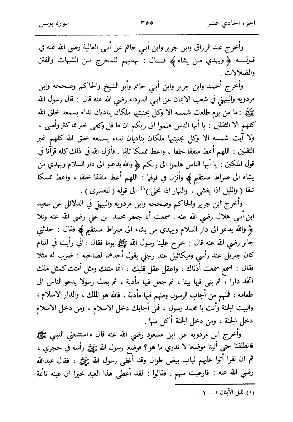 وَأخرج أَحْمد وَابْن جرير وَابْن أبي حَاتِم وَأَبُو الشَّيْخ وَالْحَاكِم وَصَححهُ وَابْن مرْدَوَيْه وَالْبَيْهَقِيّ فِي شعب الإِيمان عَن أبي الدَّرْدَاء رَضِي الله عَنهُ قَالَ: قَالَ رَسُول الله صلى الله عَلَيْهِ وَسلم مَا من يَوْم طلعت شمسه إِلَّا وكل بجنبتيها ملكان يناديان نِدَاء يسمعهُ خلق الله كلهم إِلَّا الثقلَيْن: يَا أَيهَا النَّاس هلموا إِلَى ربكُم إِن مَا قل وَكفى خير مِمَّا كثر وألهى وَلَا آبت شمسه إِلَّا وكل بجنبتيها ملكان يناديان نِدَاء يسمعهُ خلق الله كلهم غير الثقلَيْن: اللَّهُمَّ أعْط منفقاً خلفا وَأعْطِ ممسكاً تلفاً