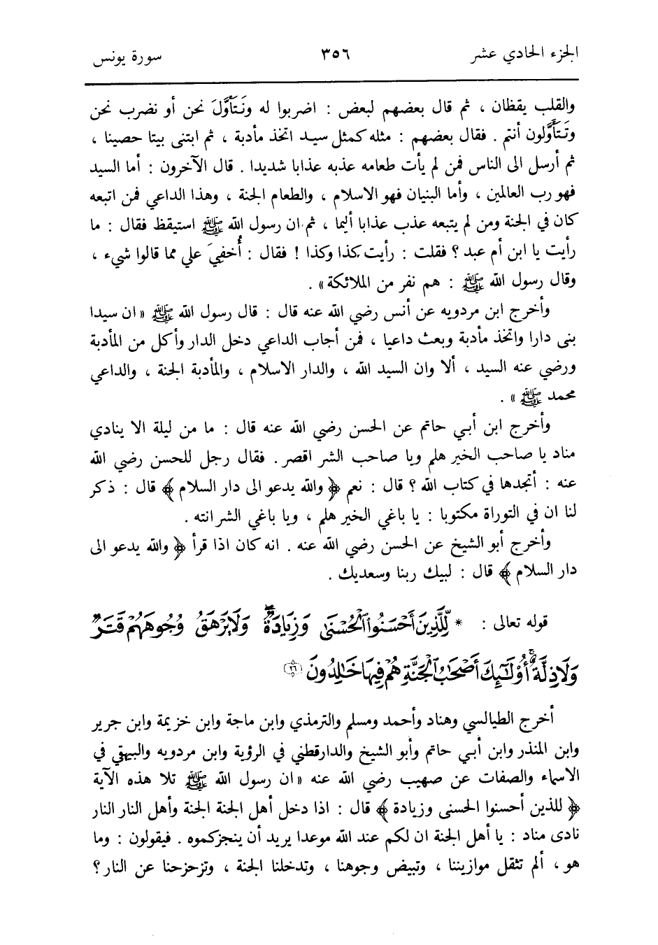 أخرج الطَّيَالِسِيّ وهناد وَأحمد وَمُسلم وَالتِّرْمِذِيّ وَابْن ماجة وَابْن خُزَيْمَة وَابْن جرير وَابْن الْمُنْذر وَابْن أبي حَاتِم وَأَبُو الشَّيْخ وَالدَّارَقُطْنِيّ فِي الرُّؤْيَة وَابْن مرْدَوَيْه وَالْبَيْهَقِيّ فِي الْأَسْمَاء وَالصِّفَات عَن صُهَيْب رَضِي الله عَنهُ أَن رَسُول الله صلى الله عَلَيْهِ وَسلم تَلا هَذِه الْآيَة {للَّذين أَحْسنُوا الْحسنى وَزِيَادَة} قَالَ: إِذا دخل أهل الْجنَّة الْجنَّة وَأهل النَّار النَّار نَادَى مُنَاد: يَا أهل الْجنَّة إِن لكم عِنْد الله موعداً يُرِيد أَن ينجزكموه