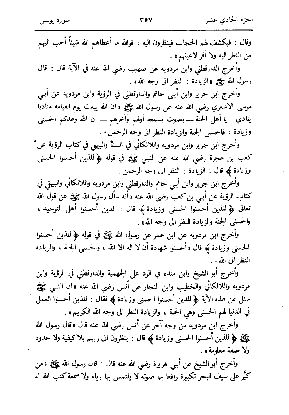 وَأخرج الدَّارَقُطْنِيّ وَابْن مرْدَوَيْه عَن صُهَيْب رَضِي الله عَنهُ فِي الْآيَة قَالَ: قَالَ رَسُول الله صلى الله عَلَيْهِ وَسلم الزِّيَادَة: النّظر إِلَى وَجه الله