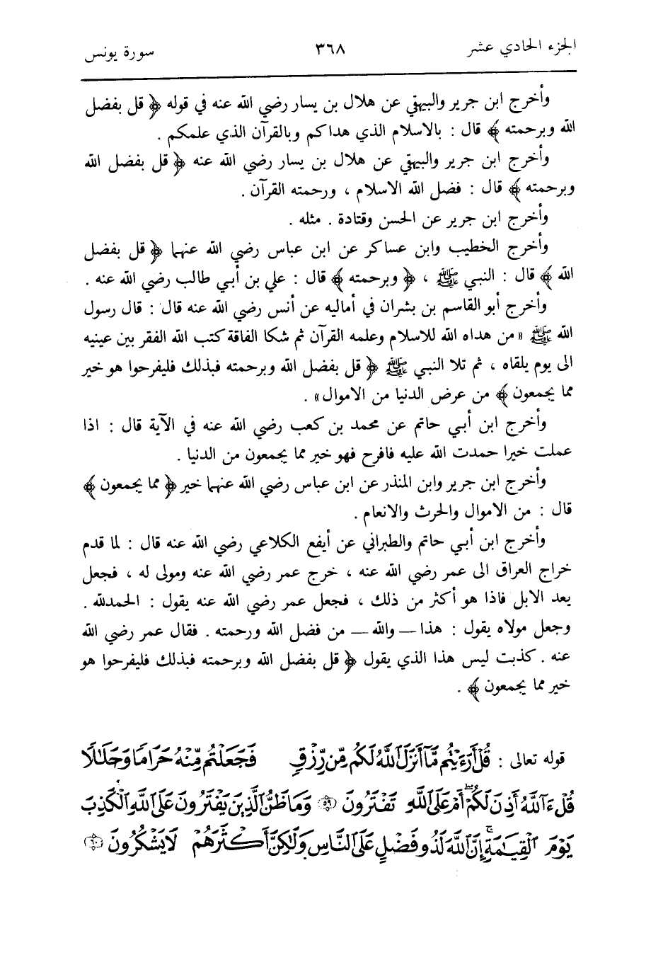 وَأخرج ابْن جرير وَالْبَيْهَقِيّ عَن هِلَال بن يسَار رَضِي الله عَنهُ فِي قَوْله {قل بِفضل الله وبرحمته} قَالَ: بالإِسلام الَّذِي هدَاكُمْ وَبِالْقُرْآنِ الَّذِي علمكُم