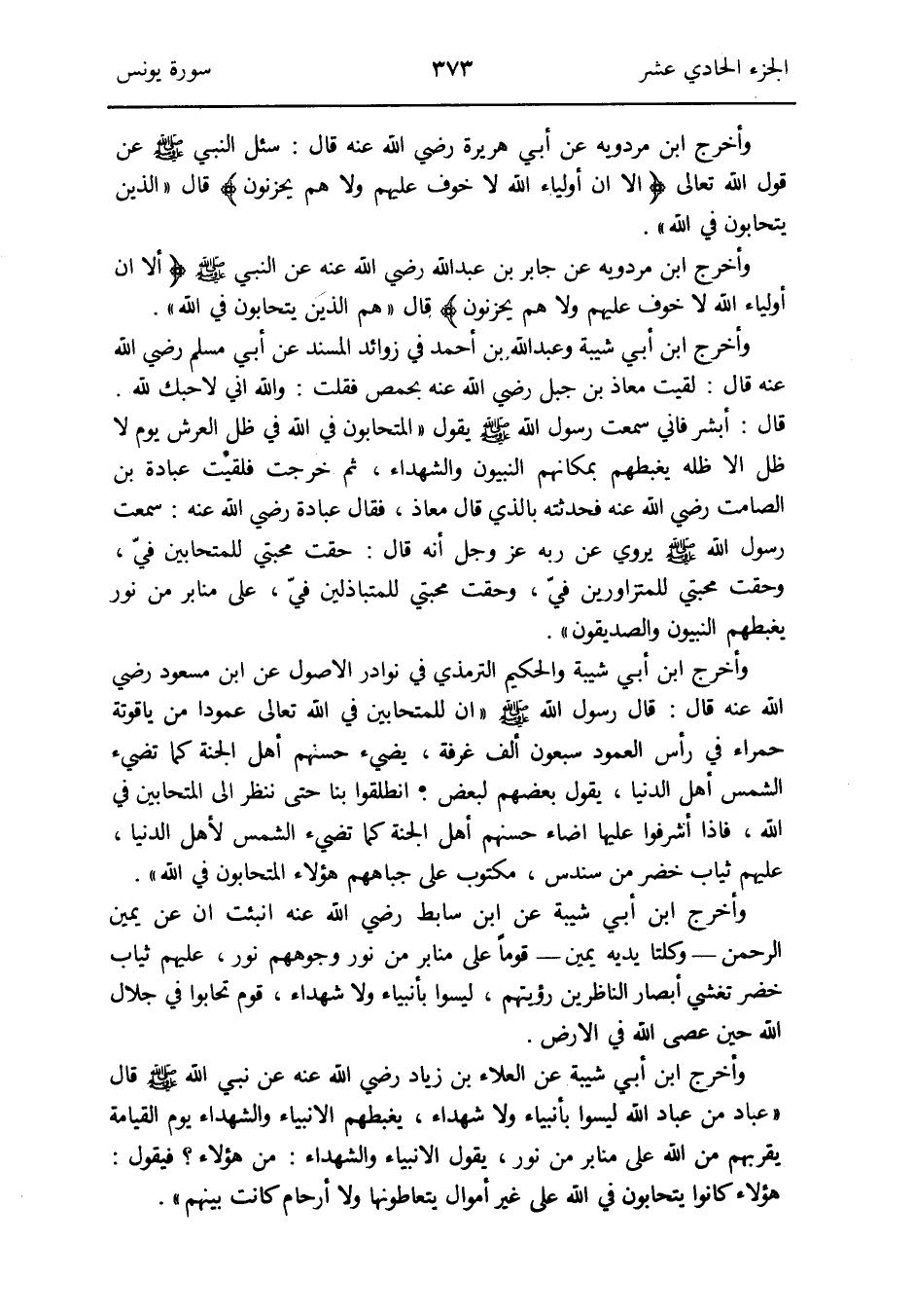 وَأخرج ابْن أبي شيبَة والحكيم التِّرْمِذِيّ فِي نَوَادِر الْأُصُول عَن ابْن مَسْعُود رَضِي الله قَالَ: قَالَ رَسُول الله صلى الله عَلَيْهِ وَسلم إِن للمتحابين فِي الله تَعَالَى عموداً من ياقوتة حَمْرَاء فِي رَأس العمود سَبْعُونَ ألف غرفَة يضيء حسنهم أهل الْجنَّة كَمَا تضيء الشَّمْس أهل الدُّنْيَا يَقُول بَعضهم لبَعض: انْطَلقُوا بِنَا حَتَّى نَنْظُر إِلَى المتحابين فِي الله فَإِذا أشرفوا عَلَيْهَا أَضَاء حسنهم أهل الْجنَّة كَمَا تضيء الشَّمْس لأهل الدُّنْيَا عَلَيْهِم ثِيَاب خضر من سندس مَكْتُوب على جباههم هَؤُلَاءِ المتحابون فِي الله