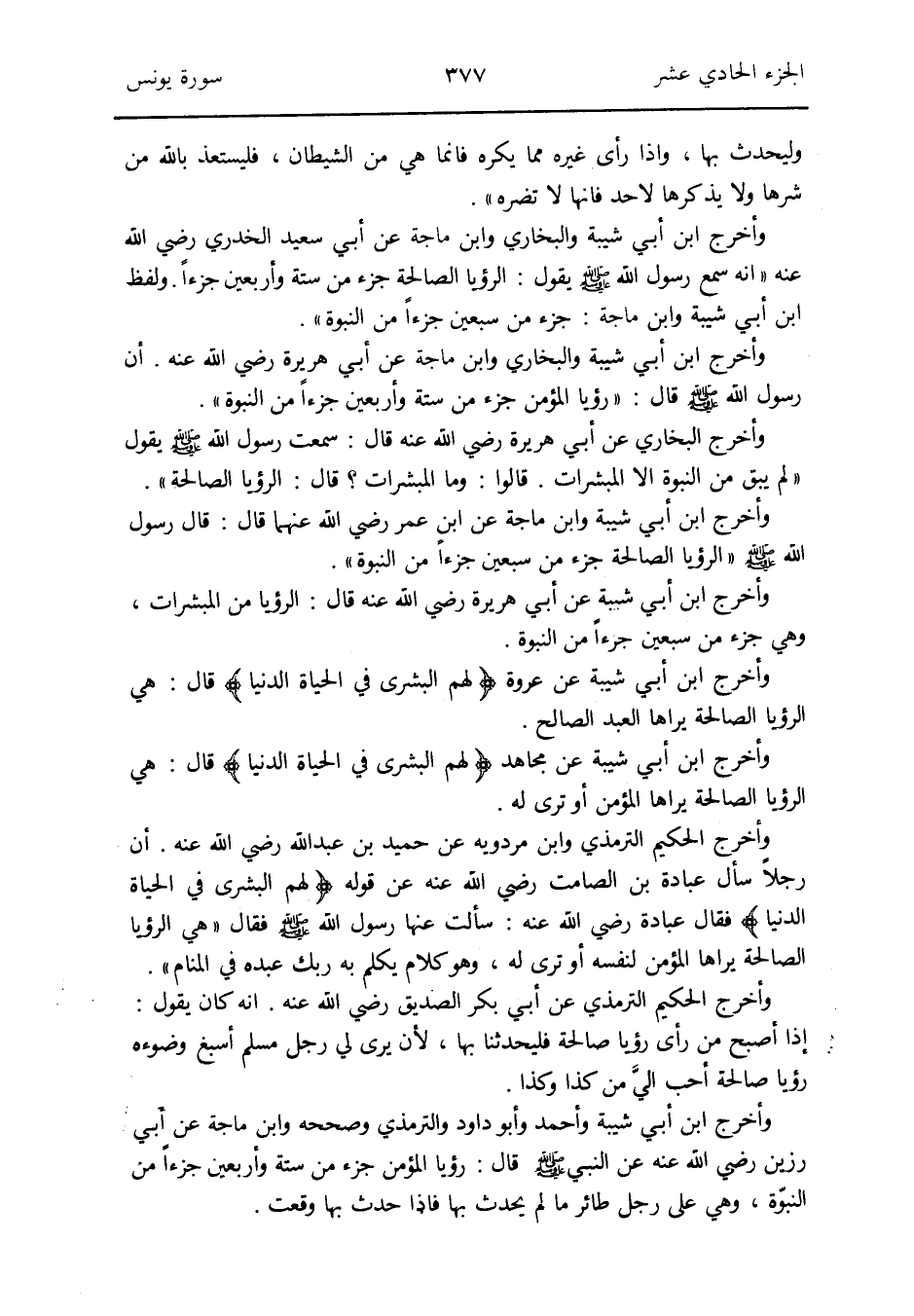 وَأخرج البُخَارِيّ عَن أبي هُرَيْرَة رضى الله عَنهُ قَالَ: سَمِعت رَسُول الله صلى الله عَلَيْهِ وَسلم يَقُول لم يبْق من النُّبُوَّة إِلَّا الْمُبَشِّرَات قَالُوا: وَمَا الْمُبَشِّرَات قَالَ: الرُّؤْيَا الصَّالِحَة
