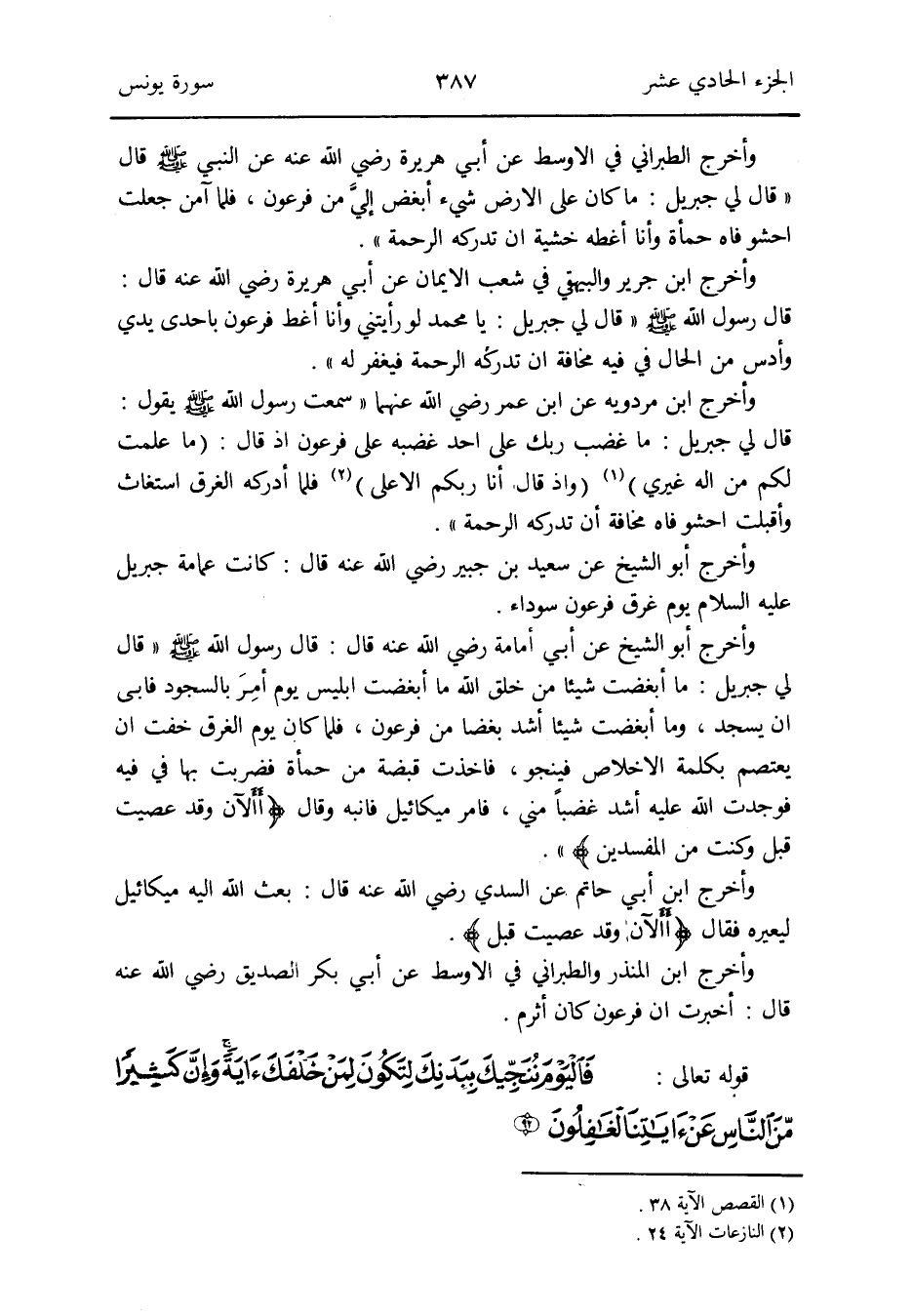 وَأخرج أَبُو الشَّيْخ عَن أبي أُمَامَة رَضِي الله عَنهُ قَالَ: قَالَ رَسُول الله صلى الله عَلَيْهِ وَسلم قَالَ لي جِبْرِيل: مَا أبغضت شَيْئا من خلق الله مَا أبغضت إِبْلِيس يَوْم أمِرَ بِالسُّجُود فَأبى أَن يسْجد وَمَا أبغضت شَيْئا أَشد بغضاً من فِرْعَوْن فَلَمَّا كَانَ يَوْم الْغَرق خفت أَن يعتصم بِكَلِمَة الاخلاص فينجو فَأخذت قَبْضَة من حمأة فَضربت بهَا فِي فِيهِ فَوجدت الله عَلَيْهِ أَشد غَضبا مني فَأمر مِيكَائِيل فأنبه وَقَالَ {آلآن وَقد عصيت قبل وَكنت من المفسدين}