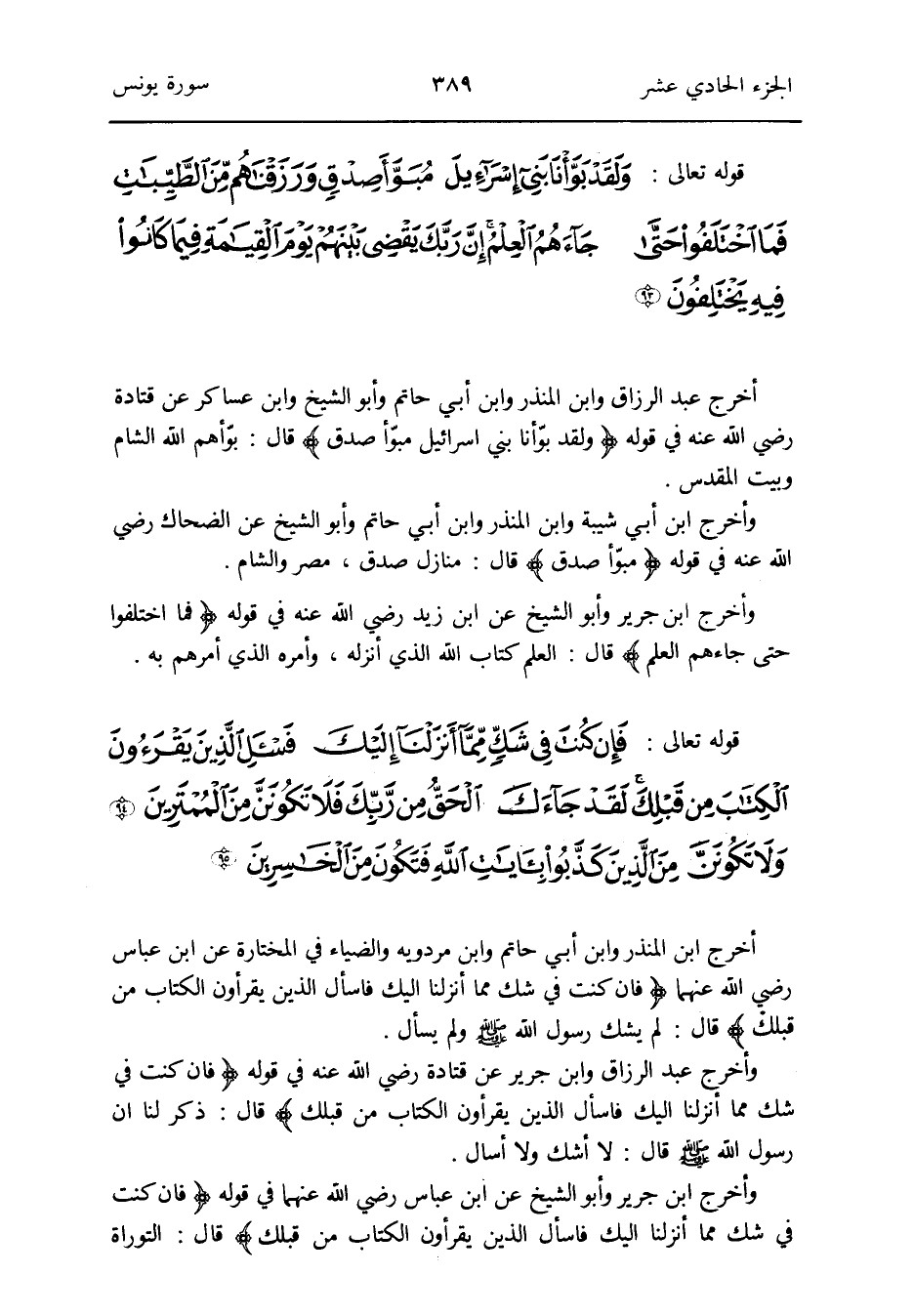 وَأخرج ابْن جرير وَأَبُو الشَّيْخ عَن ابْن عَبَّاس رَضِي الله عَنْهُمَا فِي قَوْله {فَإِن كنت فِي شكّ مِمَّا أنزلنَا إِلَيْك فاسأل الَّذين يقرؤون الْكتاب من قبلك} قَالَ: التَّوْرَاة