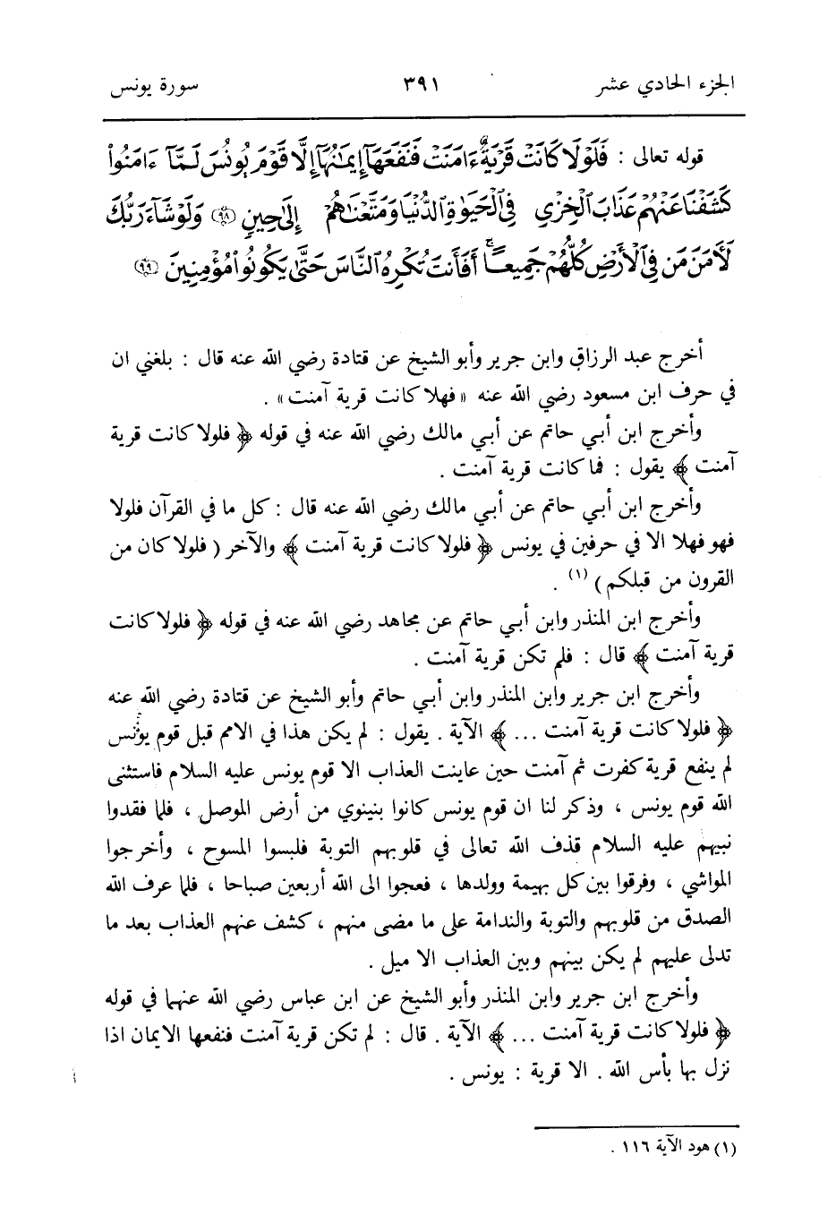 وَأخرج ابْن جرير وَابْن الْمُنْذر وَأَبُو الشَّيْخ عَن ابْن عَبَّاس رَضِي الله عَنْهُمَا فِي قَوْله {فلولا كَانَت قَرْيَة آمَنت} الْآيَة