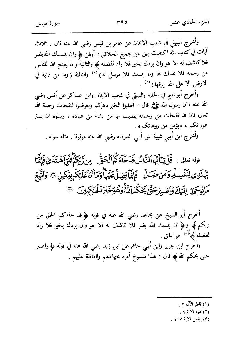 وَأخرج الْبَيْهَقِيّ فِي شعب الإِيمان عَن عَامر بن قيس رَضِي الله عَنهُ قَالَ: ثَلَاث آيَات فِي كتاب الله اكتفيت بِهن عَن جَمِيع الْخَلَائق: أولهنَّ {وَإِن يمسسك الله بضر فَلَا كاشف لَهُ إِلَّا هُوَ وَإِن يردك بِخَير فَلَا راد لفضله} وَالثَّانيَِة (مَا يفتح الله للنَّاس من رَحْمَة فَلَا مُمْسك لَهَا وَمَا يمسك فَلَا مُرْسل لَهُ) (فاطر الْآيَة 2) وَالثَّالِثَة (وَمَا من دَابَّة فِي الأَرْض إِلَّا على الله رزقها) (هود الْآيَة 6)