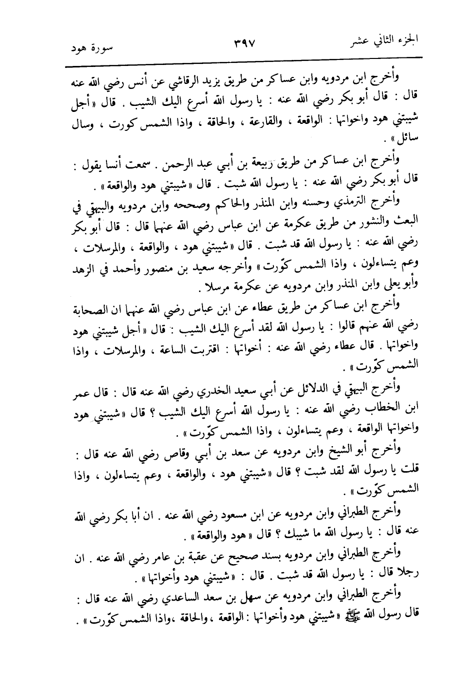 وَأخرج أَبُو الشَّيْخ وَابْن مرْدَوَيْه عَن سعد بن أبي وَقاص رَضِي الله عَنهُ قَالَ: قلت يَا رَسُول الله لقد شبت قَالَ: شيبتنش هود والواقعة وَعم يتسألون وَإِذا الشَّمْس كورت