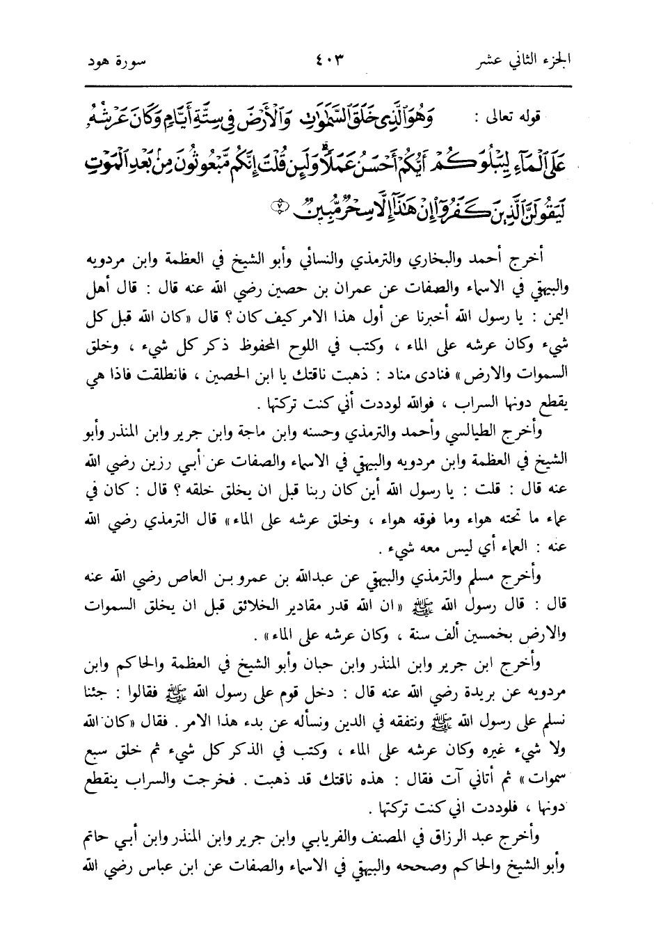 وَأخرج الطَّيَالِسِيّ وَأحمد وَالتِّرْمِذِيّ وَحسنه وَابْن ماجة وَابْن جرير وَابْن الْمُنْذر وَأَبُو الشَّيْخ فِي العظمة وَابْن مرْدَوَيْه وَالْبَيْهَقِيّ فِي الْأَسْمَاء وَالصِّفَات عَن أبي رزين رَضِي الله عَنهُ قَالَ: قلت: يَا رَسُول الله أَيْن كَانَ رَبنَا قبل أَن يخلق خلقه قَالَ: كَانَ فِي عماء مَا تَحْتَهُ هَوَاء وَمَا فَوْقه هَوَاء وَخلق عَرْشه على المَاء قَالَ التِّرْمِذِيّ رَضِي الله عَنهُ: العماء: أَي لَيْسَ مَعَه شَيْء