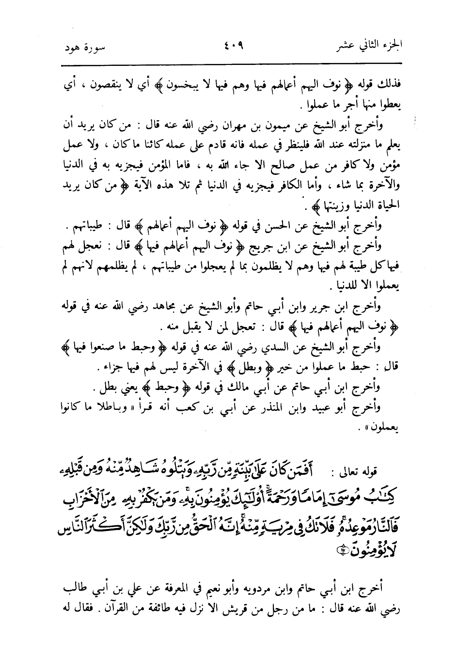 وَأخرج أَبُو الشَّيْخ عَن ابْن جريج {نوف إِلَيْهِم أَعْمَالهم فِيهَا} قَالَ: نعجل لَهُم فِيهَا كل طيبَة لَهُم فِيهَا وهم لَا يظْلمُونَ بِمَا لم يعجلوا من طَيِّبَاتهمْ لم يظلمهم لأَنهم لم يعلمُوا إِلَّا الدُّنْيَا