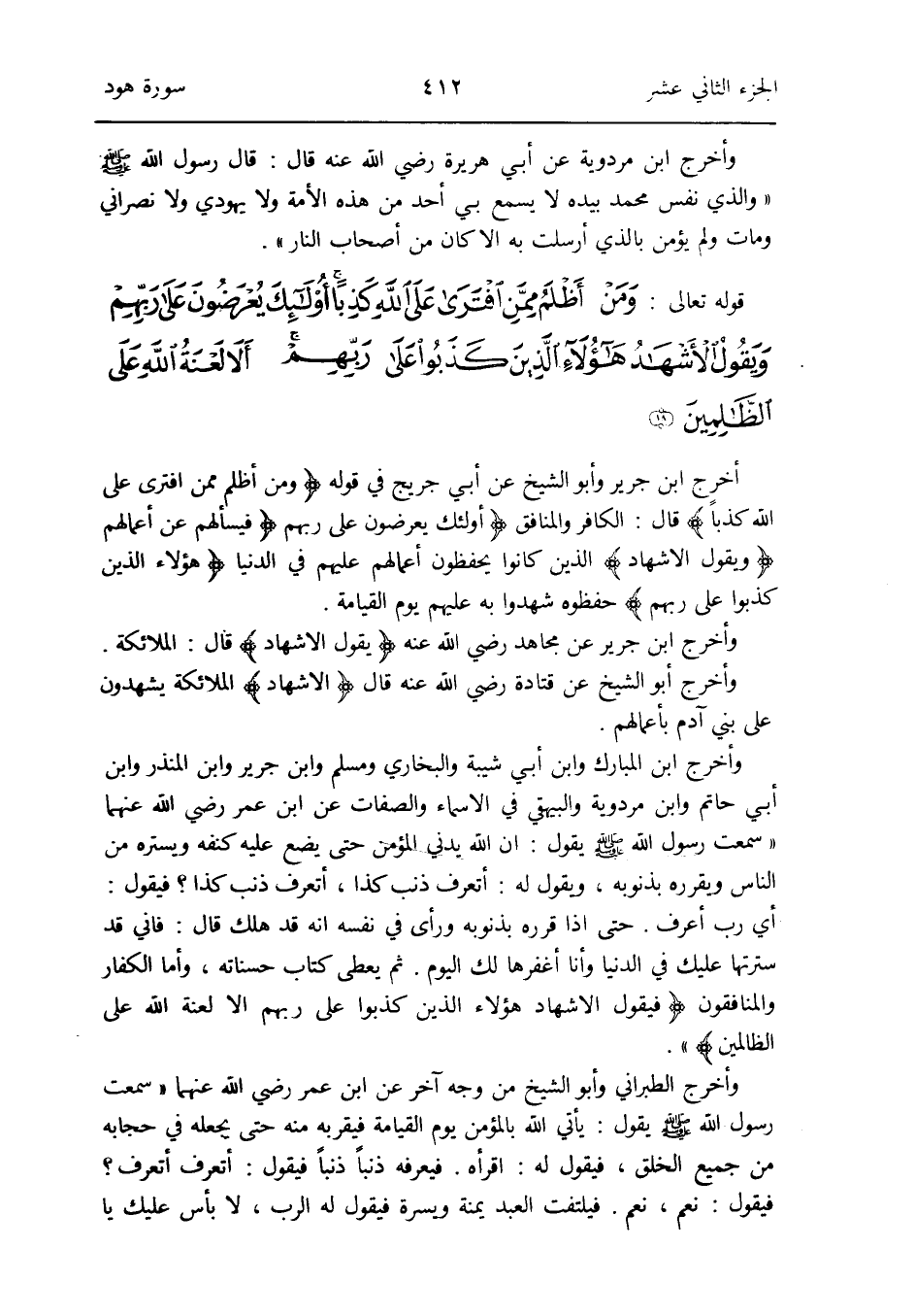 وَأخرج ابْن الْمُبَارك وَابْن أبي شيبَة وَالْبُخَارِيّ وَمُسلم وَابْن جرير وَابْن الْمُنْذر وَابْن أبي حَاتِم وَابْن مرْدَوَيْه وَالْبَيْهَقِيّ فِي الْأَسْمَاء وَالصِّفَات عَن ابْن عمر رَضِي الله عَنْهُمَا سَمِعت رَسُول الله صلى الله عَلَيْهِ وَسلم يَقُول: إِن الله يدني الْمُؤمن حَتَّى يضع عَلَيْهِ كنفه ويستره من النَّاس ويقرره بذنوبه وَيَقُول لَهُ: اتعرف ذَنْب كَذَا أتعرف ذَنْب كَذَا فَيَقُول: أَي رب أعرف