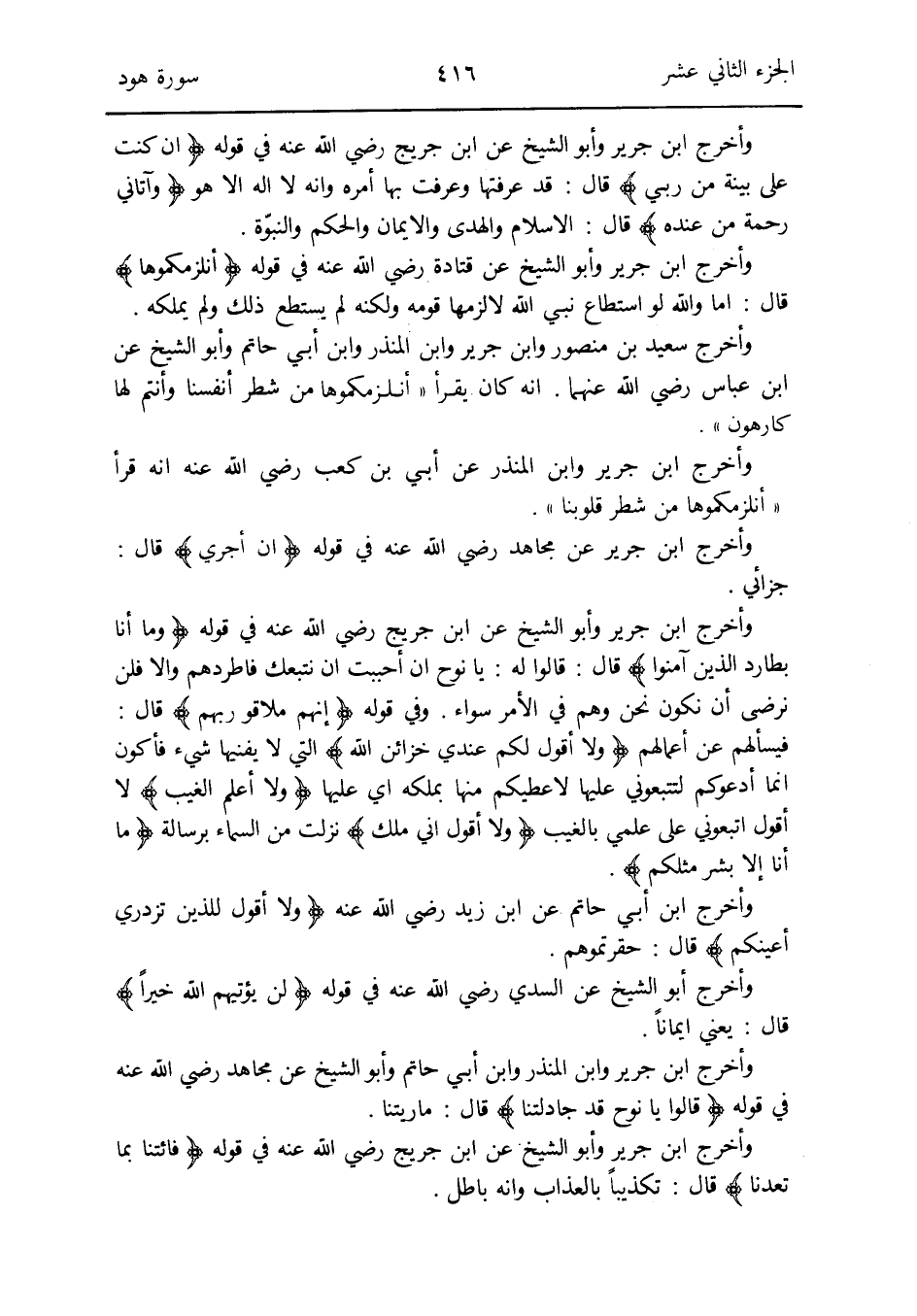 وَفِي قَوْله {إِنَّهُم ملاقوا رَبهم} قَالَ: فيسألهم عَن أَعْمَالهم {وَلَا أَقُول لكم عِنْدِي خَزَائِن الله} الَّتِي لَا يفنيها شَيْء فَأَكُون إِنَّمَا أدعوكم لتتبعوني عَلَيْهَا لأعطيكم مِنْهَا بِملكه أَي عَلَيْهَا {وَلَا أعلم الْغَيْب} لَا أَقُول اتبعوني على علمي بِالْغَيْبِ {وَلَا أَقُول إِنِّي ملك} نزلت من السَّمَاء برسالة {مَا أَنا إِلَّا بشر مثلكُمْ}