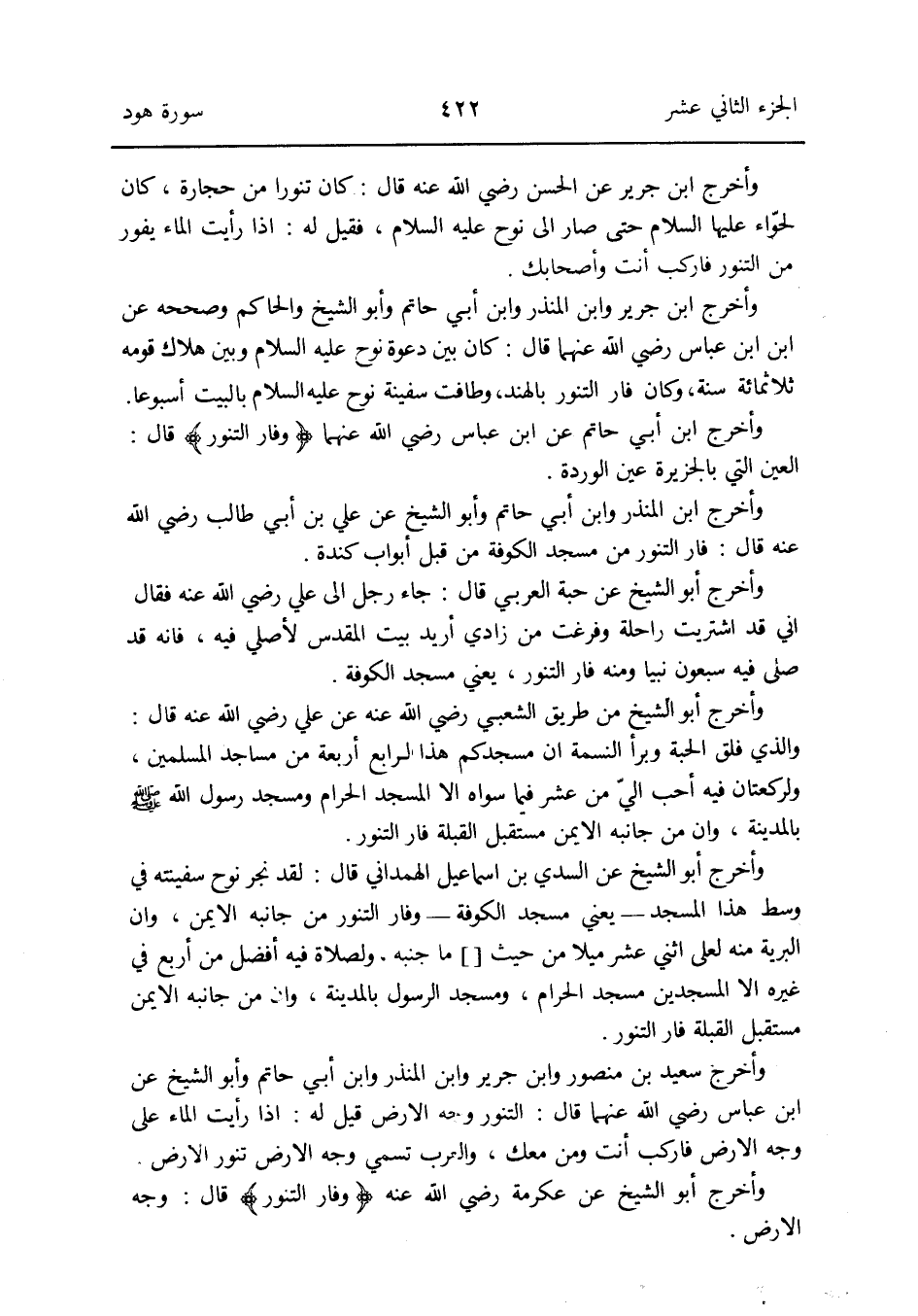 وَأخرج سعيد بن مَنْصُور وَابْن جرير وَابْن الْمُنْذر وَابْن أبي حَاتِم وَأَبُو الشَّيْخ عَن ابْن عَبَّاس رَضِي الله عَنْهُمَا قَالَ: التَّنور وَجه الأَرْض قيل لَهُ: إِذا رَأَيْت المَاء على وَجه الأَرْض فاركب أَنْت وَمن مَعَك وَالْعرب تسمي وَجه الأَرْض تنور الأَرْض