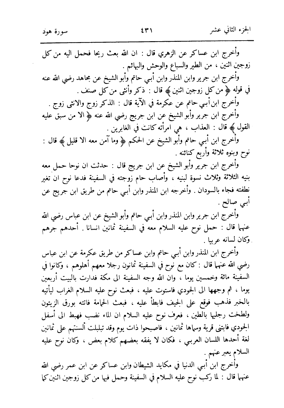 وَأخرج ابْن جرير وَابْن الْمُنْذر وَابْن أبي حَاتِم وَأَبُو الشَّيْخ عَن ابْن عَبَّاس رَضِي الله عَنْهُمَا قَالَ: حمل نوح عَلَيْهِ السَّلَام مَعَه فِي السَّفِينَة ثَمَانِينَ إنْسَانا