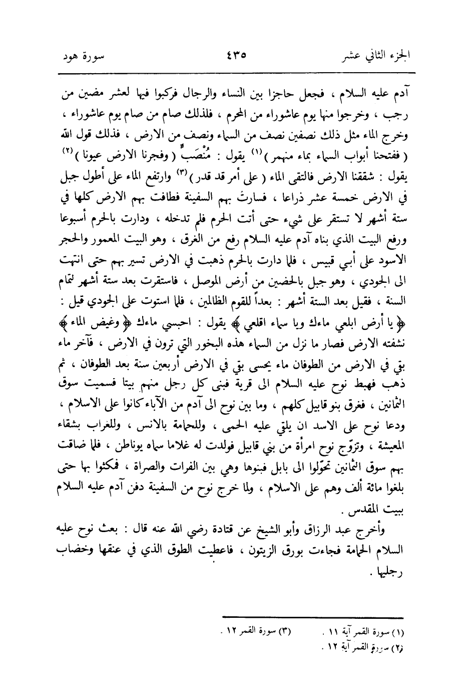 آدم عَلَيْهِ السَّلَام فَجعل حاجزاً بَين النِّسَاء وَالرِّجَال فَرَكبُوا فِيهَا لعشر مضين من رَجَب وَخَرجُوا مِنْهَا يَوْم عَاشُورَاء من الْمحرم فَلذَلِك صَامَ من صَامَ يَوْم عَاشُورَاء وَخرج المَاء مثل ذَلِك نِصْفَيْنِ نصف من السَّمَاء وَنصف من الأَرْض فَذَلِك قَول الله (ففتحنا أَبْوَاب السَّمَاء بِمَاء منهمر) (سُورَة الْقَمَر آيَة 11) يَقُول: مُنْصَبٍّ (وفجرنا الأَرْض عيُونا) (سُورَة الْقَمَر آيَة 12) يَقُول: شققنا الأَرْض فَالتقى المَاء (على أَمر قد قدر) (سُورَة الْقَمَر 12) وارتفع المَاء على أطول جبل فِي الأَرْض خَمْسَة عشر ذِرَاعا فسارت بهم السَّفِينَة فطافت بهم الأَرْض كلهَا فِي سِتَّة أشهر لَا تَسْتَقِر على شَيْء حَتَّى أَتَت الْحرم فَلم تدخله ودارت بِالْحرم أسبوعاً وَرفع الْبَيْت الَّذِي بناه آدم عَلَيْهِ السَّلَام رفع من الْغَرق وَهُوَ الْبَيْت الْمَعْمُور وَالْحجر الْأسود على أبي قبيس