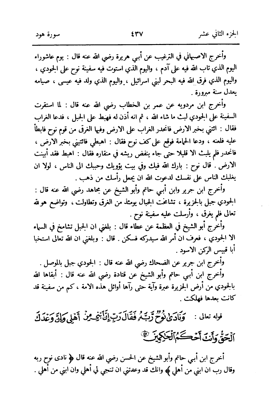 أخرج ابْن أبي حَاتِم وَأَبُو الشَّيْخ عَن الْحسن رَضِي الله عَنهُ قَالَ {ونادى نوح ربه فَقَالَ رب إِن ابْني من أَهلِي} وَإنَّك قد وَعَدتنِي أَن تنجي لي أَهلِي وان ابْني من أَهلِي