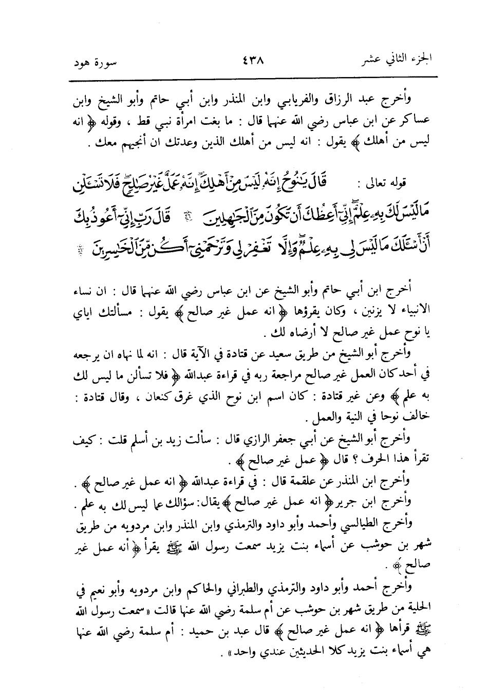 وَأخرج أَحْمد وَأَبُو دَاوُد وَالتِّرْمِذِيّ وَالطَّبَرَانِيّ وَالْحَاكِم وَابْن مرْدَوَيْه وَأَبُو نعيم فِي الْحِلْية من طَرِيق شهر بن حَوْشَب عَن أم سَلمَة رضى الله عَنهُ قَالَ: سَمِعت رَسُول الله صلى الله عَلَيْهِ وَسلم قَرَأَهَا {إِنَّه عمل غير صَالح} قَالَ عبد بن حميد: أم سَلمَة رَضِي الله عَنْهَا هِيَ أَسمَاء بنت يزِيد كلا الْحَدِيثين عِنْدِي وَاحِد