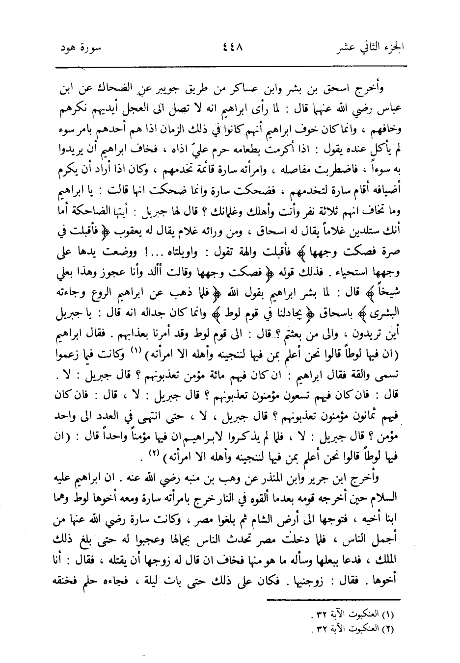 وَأخرج اسحق بن بشر وَابْن عَسَاكِر من طَرِيق جُوَيْبِر عَن الضَّحَّاك عَن ابْن عَبَّاس رَضِي الله عَنْهُمَا قَالَ: لما رأى إِبْرَاهِيم أَنه لَا تصل إِلَى الْعجل أَيْديهم نكرهم وخافهم وَإِنَّمَا كَانَ خوف إِبْرَاهِيم أَنهم كَانُوا فِي ذَلِك الزَّمَان إِذا هم أحدهم بِأَمْر سوء لم يَأْكُل عِنْده يَقُول: إِذا أكرمت بطعامه حرم عليّ أَذَاهُ فخاف إِبْرَاهِيم أَن يُرِيدُوا بِهِ سوءا فاضطربت مفاصله وَامْرَأَته سارة قَائِمَة تخدمهم وَكَانَ إِذا أَرَادَ أَن يكرم أضيافه أَقَامَ سارة لتخدمهم فَضَحكت سارة وَإِنَّمَا ضحِكت انها قَالَت: يَا إِبْرَاهِيم وَمَا تخَاف أَنهم ثَلَاثَة نفر وَأَنت وَأهْلك وغلمانك قَالَ لَهَا جِبْرِيل: أيتها الضاحكة أما أَنَّك ستلدين غُلَاما يُقَال لَهُ إِسْحَاق وَمن وَرَائه غُلَام يُقَال لَهُ يَعْقُوب {فَأَقْبَلت امْرَأَته فِي صرة فصكت وَجههَا} فَأَقْبَلت والهة تَقول: واويلتاه