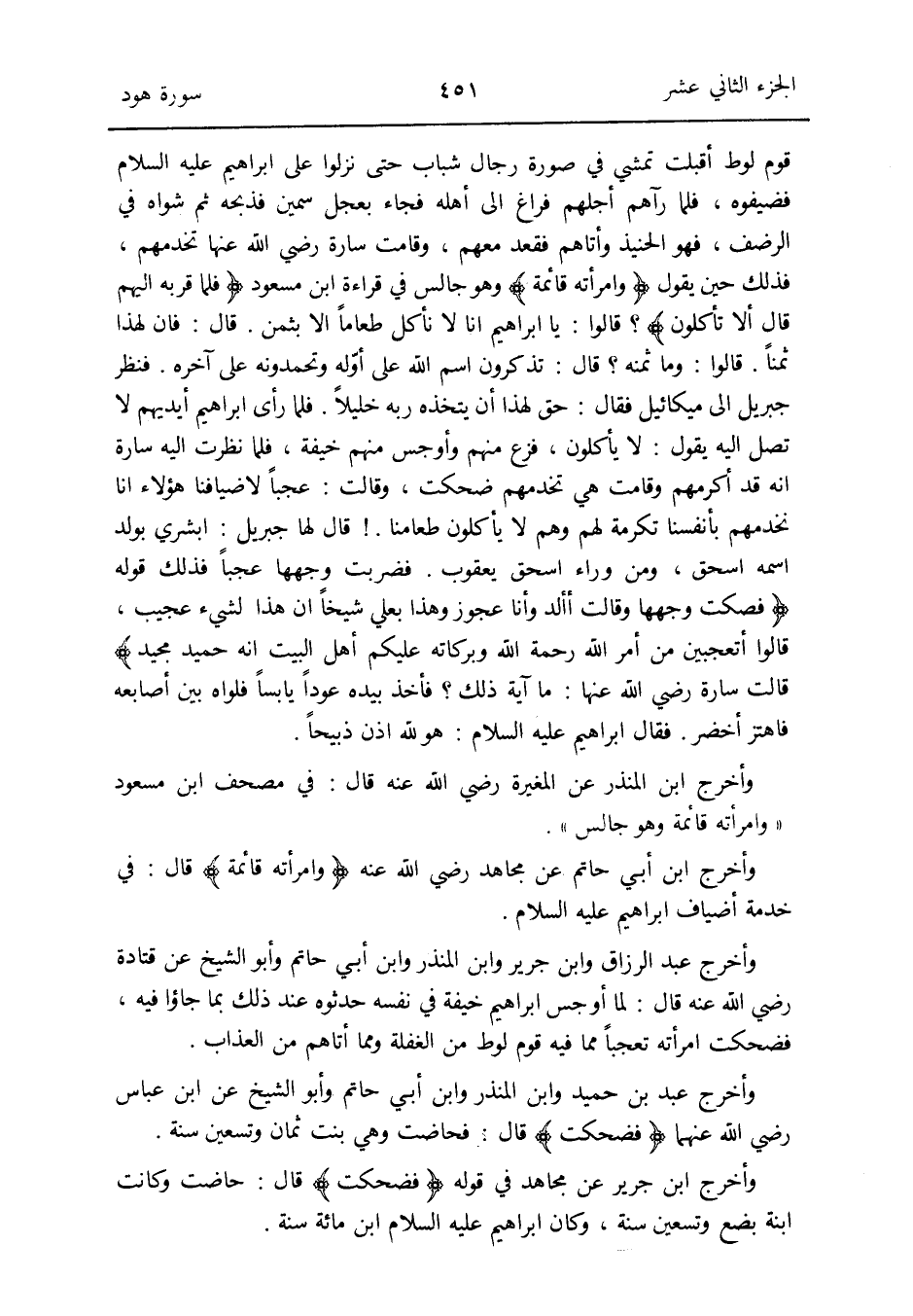 قوم لوط أَقبلت تمشي فِي صُورَة رجال شباب حَتَّى نزلُوا على إِبْرَاهِيم السَّلَام فضيفوه فَلَمَّا رَآهُمْ أَجلهم فرَاغ إِلَى أَهله فجَاء بعجل سمين فذبحه ثمَّ شواه فِي الرضف فَهُوَ الحنيذ وأتاهم فَقعدَ مَعَهم وَقَامَت سارة رَضِي الله عَنْهَا تخدمهم فَذَلِك حِين يَقُول {وَامْرَأَته قَائِمَة} وَهُوَ جَالس فِي قِرَاءَة ابْن مَسْعُود / فَلَمَّا قربه إِلَيْهِم قَالَ أَلا تَأْكُلُونَ / قَالُوا: يَا إِبْرَاهِيم إِنَّا لَا نَأْكُل طَعَاما إِلَّا بِثمن