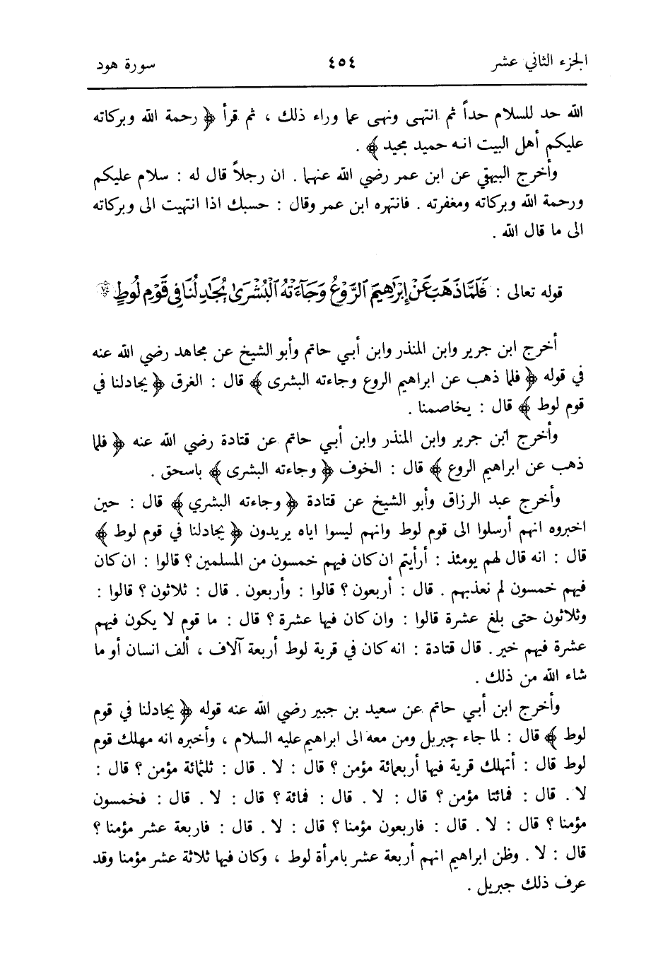 وَأخرج ابْن أبي حَاتِم عَن سعيد بن جُبَير رَضِي الله عَنهُ فِي قَوْله {يجادلنا فِي قوم لوط} قَالَ: لما جَاءَ جِبْرِيل وَمن مَعَه إِلَى إِبْرَاهِيم عَلَيْهِ السَّلَام وَأخْبرهُ أَنه مهلك قوم لوط قَالَ: أتهلك قَرْيَة فِيهَا أَرْبَعمِائَة مُؤمن قَالَ: لَا