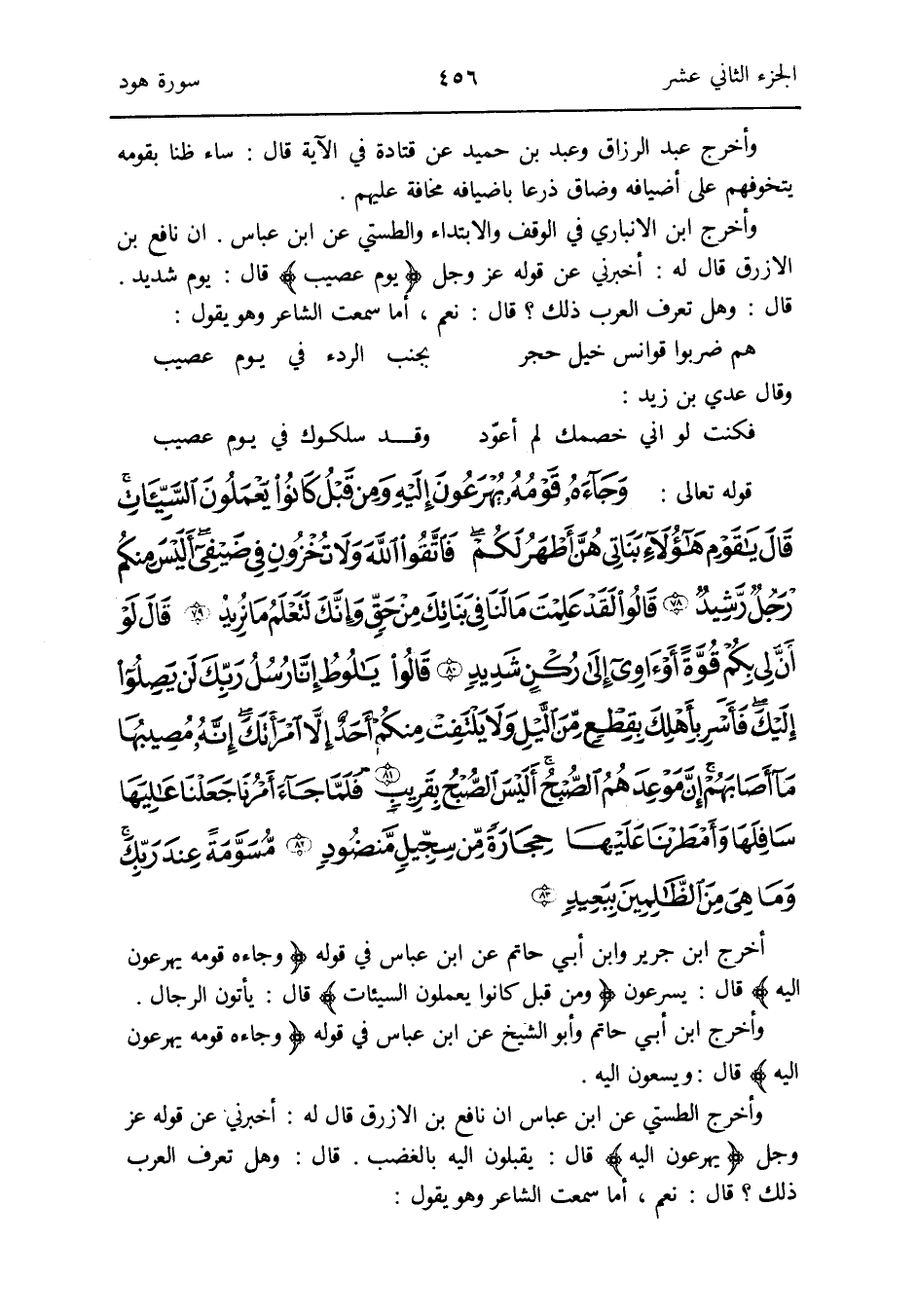 وَأخرج الطستي عَن ابْن عَبَّاس أَن نَافِع بن الْأَزْرَق قَالَ لَهُ: أَخْبرنِي عَن قَوْله عزَّ وَجل {يهرعون إِلَيْهِ} قَالَ: يقبلُونَ إِلَيْهِ بِالْغَضَبِ