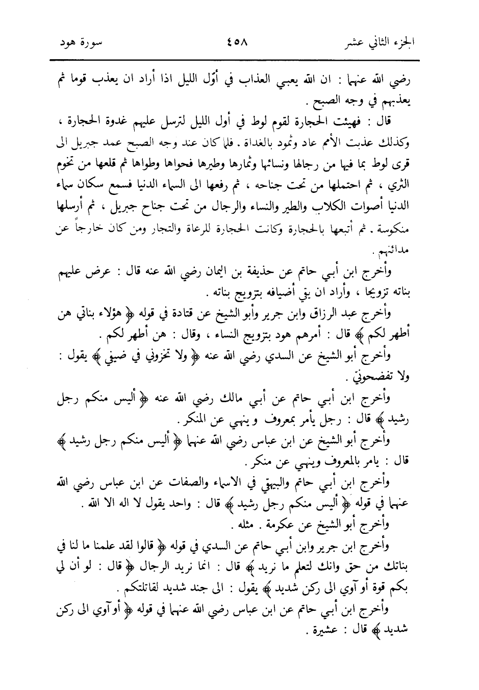 وَأخرج ابْن جرير وَابْن أبي حَاتِم عَن السّديّ فِي قَوْله {قَالُوا لقد علمت مَا لنا فِي بناتك من حق وَإنَّك لتعلم مَا نُرِيد} قَالَ: إِنَّمَا نُرِيد الرِّجَال {قَالَ لَو أَن لي بكم قُوَّة أَو آوي إِلَى ركن شَدِيد} يَقُول: إِلَى جند شَدِيد لقاتلتكم