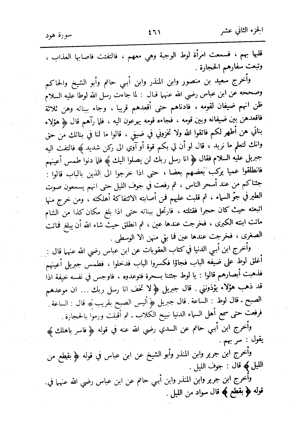 وَأخرج سعيد بن مَنْصُور وَابْن الْمُنْذر وَابْن أبي حَاتِم وَأَبُو الشَّيْخ وَالْحَاكِم وَصَححهُ عَن ابْن عَبَّاس رَضِي الله عَنْهُمَا قَالَ: لما جَاءَت رسل الله لوطاً عَلَيْهِ السَّلَام ظن أَنهم ضيفان لِقَوْمِهِ فادناهم حَتَّى أقعدهم قَرِيبا وَجَاء ببناته وَهن ثَلَاثَة فأقعدهن بَين ضيفانه وَبَين قومه فَجَاءَهُ قومه يهرعون إِلَيْهِ فَلَمَّا رَآهُمْ قَالَ {هَؤُلَاءِ بَنَاتِي هن أطهر لكم فَاتَّقُوا الله وَلَا تخزونِ فِي ضَيْفِي} قَالُوا {مَا لنا فِي بناتك من حق وَإنَّك لتعلم مَا نُرِيد قَالَ لَو أَن لي بكم قُوَّة أَو آوي إِلَى ركن شَدِيد} فَالْتَفت إِلَيْهِ جِبْرِيل عَلَيْهِ السَّلَام فَقَالَ {إِنَّا رسل رَبك لن يصلوا إِلَيْك} فَلَمَّا دنو طمس أَعينهم فَانْطَلقُوا عميا يركب بَعضهم بَعْضًا حَتَّى إِذا خَرجُوا إِلَى الَّذين بِالْبَابِ قَالُوا: جئناكم من عِنْد أَسحر النَّاس ثمَّ رفعت فِي جَوف اللَّيْل حَتَّى إِنَّهُم يسمعُونَ صَوت الطير فِي جوّ السَّمَاء ثمَّ قلبت عَلَيْهِم فَمن أَصَابَته الائتفاكة أهلكته وَمن خرج مِنْهَا اتبعته حَيْثُ كَانَ حجرا فَقتلته فارتحل ببناته حَتَّى بلغ مَكَان كَذَا من الشَّام مَاتَت ابْنَته الْكُبْرَى فَخرجت عِنْدهَا عين ثمَّ انْطلق حَيْثُ شَاءَ الله أَن يبلغ فَمَاتَتْ الصُّغْرَى فَخرجت عِنْدهَا عين فَمَا بَقِي مِنْهُنَّ إِلَّا الْوُسْطَى