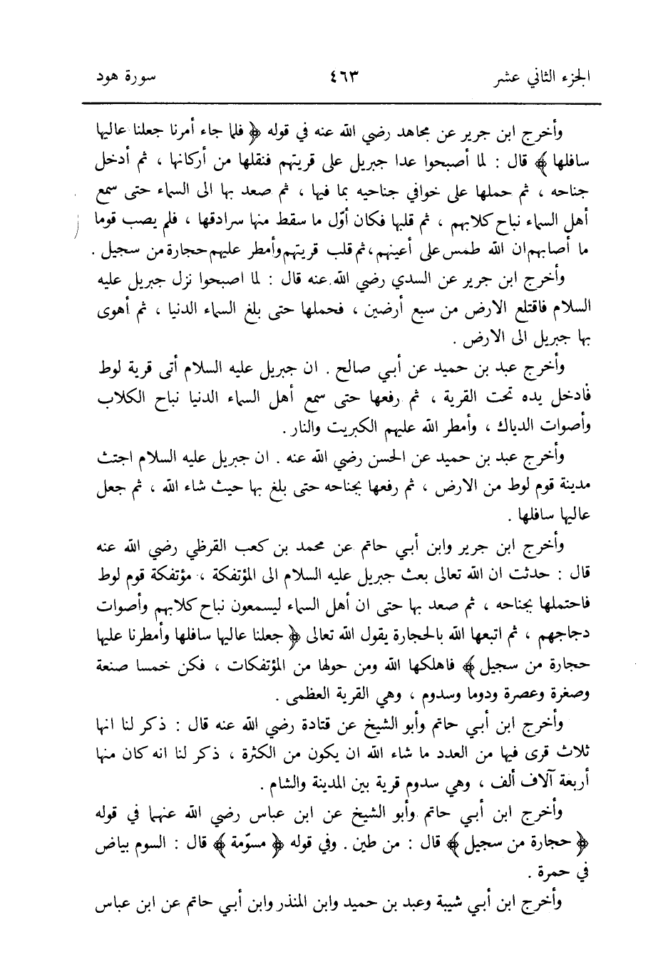 وَأخرج ابْن جرير عَن مُجَاهِد رَضِي الله عَنهُ فِي قَوْله {فَلَمَّا جَاءَ أمرنَا جعلنَا عاليها سافلها} قَالَ: لما أَصْبحُوا عدا جِبْرِيل على قريتهم فنقلها من أَرْكَانهَا ثمَّ أَدخل جنَاحه ثمَّ حملهَا على خوافي جناحيه بِمَا فِيهَا ثمَّ صعد بهَا إِلَى السَّمَاء حَتَّى سمع أهل السَّمَاء نباح كلابهم ثمَّ قَلبهَا فَكَانَ أول مَا سقط مِنْهَا سرادقها فَلم يصب قوما مَا أَصَابَهُم إِن الله طمس على أَعينهم ثمَّ قلب قريتهم وأمطر عَلَيْهِم حِجَارَة من سجيل