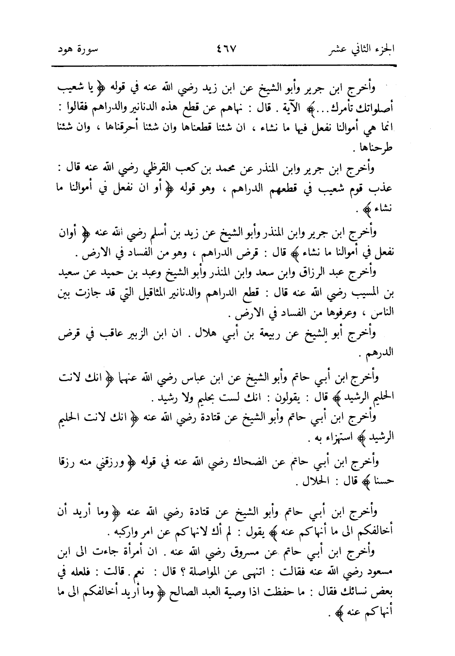 وَأخرج ابْن جرير وَابْن الْمُنْذر وَأَبُو الشَّيْخ عَن زيد بن أسلم رَضِي الله عَنهُ {أَو أَن نَفْعل فِي أَمْوَالنَا مَا نشَاء} قَالَ: قرض الدَّرَاهِم وَهُوَ من الْفساد فِي الأَرْض