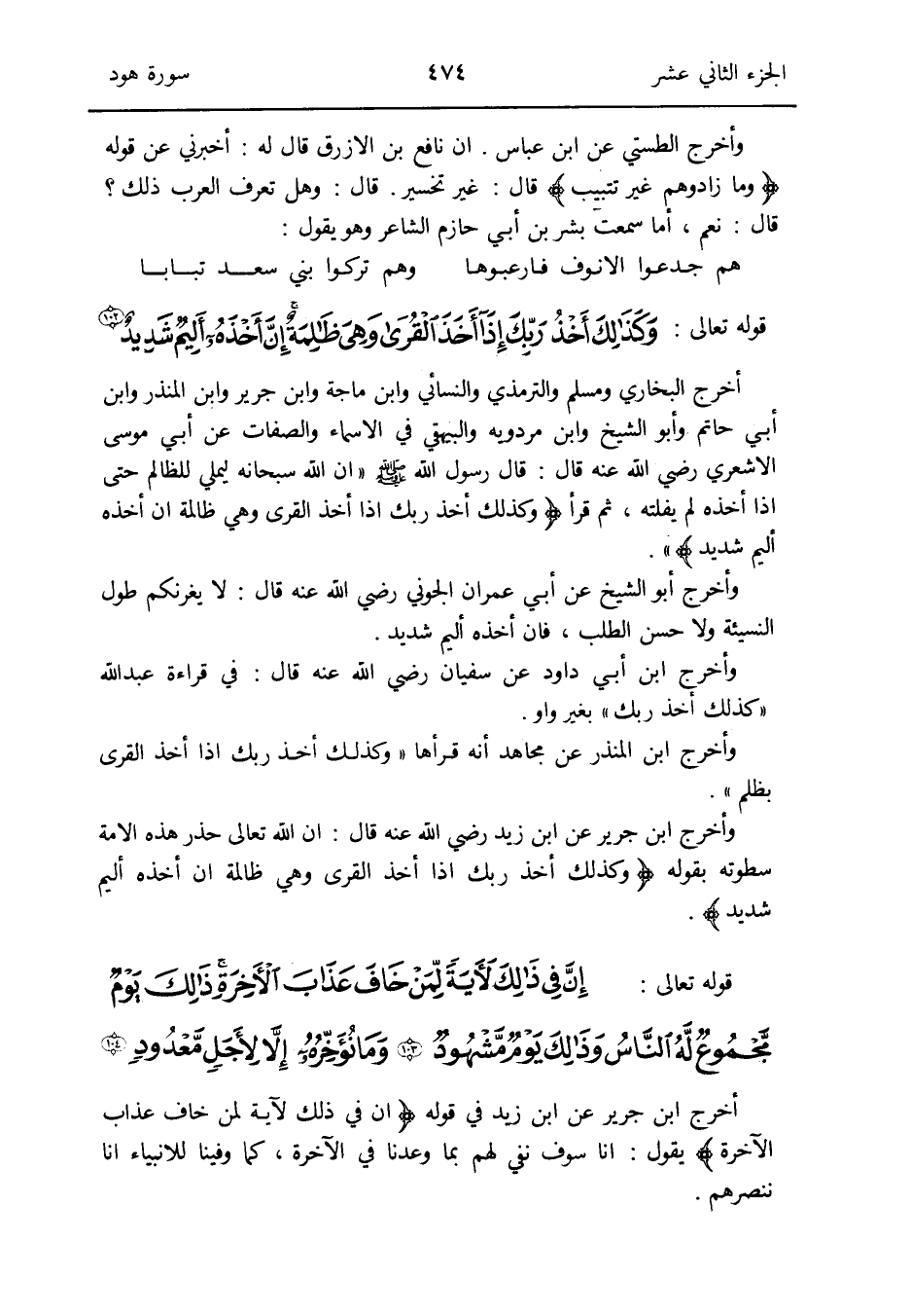 أخرج البُخَارِيّ وَمُسلم وَالتِّرْمِذِيّ وَالنَّسَائِيّ وَابْن ماجة وَابْن جرير وَابْن الْمُنْذر وَابْن أبي حَاتِم وَأَبُو الشَّيْخ وَابْن مرْدَوَيْه وَالْبَيْهَقِيّ فِي الْأَسْمَاء وَالصِّفَات عَن أبي مُوسَى الْأَشْعَرِيّ رَضِي الله عَنهُ قَالَ: قَالَ رَسُول الله صلى الله عَلَيْهِ وَسلم إِن الله سُبْحَانَهُ ليملي للظالم حَتَّى إِذا أَخَذته لم يفلته ثمَّ قَرَأَ {وَكَذَلِكَ أَخذ رَبك إِذا أَخذ الْقرى وَهِي ظالمة إِن أَخذه أَلِيم شَدِيد}