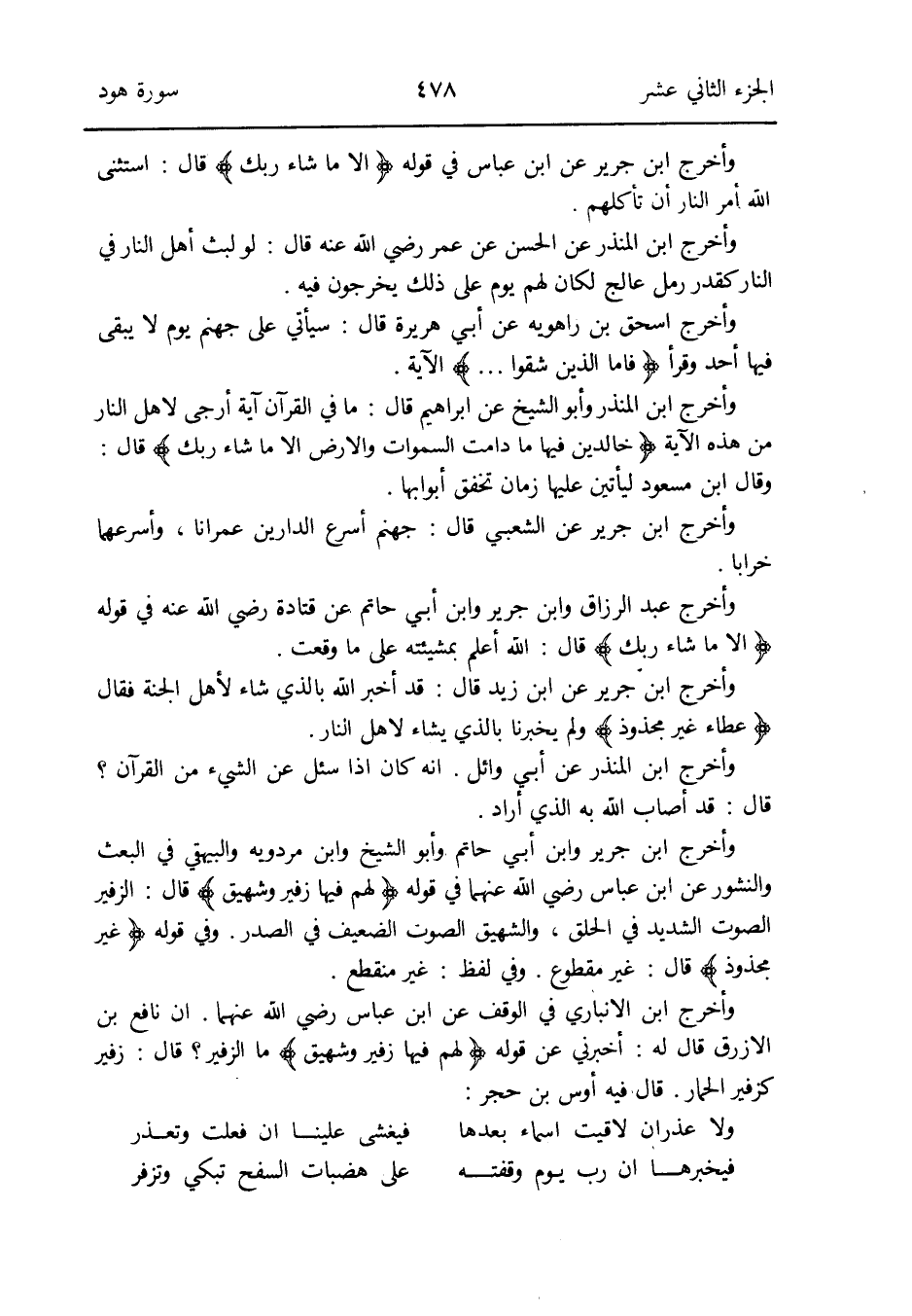 وَأخرج ابْن جرير عَن ابْن زيد قَالَ: قد أخبر الله بِالَّذِي شَاءَ لأهل الْجنَّة فَقَالَ {عَطاء غير مجذوذ} وَلم يخبرنا بِالَّذِي يَشَاء لأهل النَّار