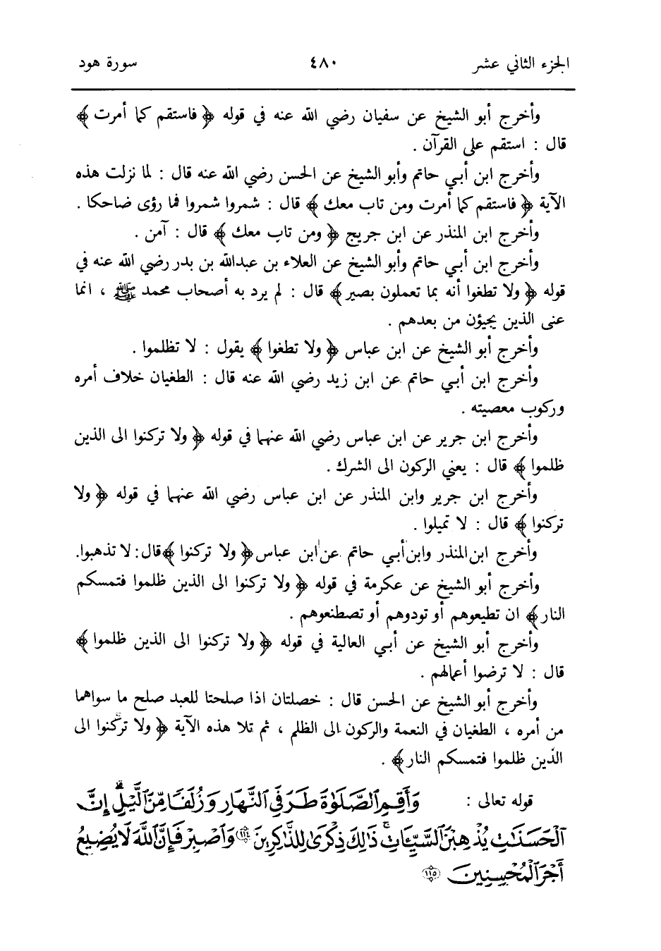 وَأخرج ابْن جرير عَن ابْن عَبَّاس رَضِي الله عَنْهُمَا فِي قَوْله {وَلَا تركنوا إِلَى الَّذين ظلمُوا} قَالَ: يَعْنِي الركون إِلَى الشّرك