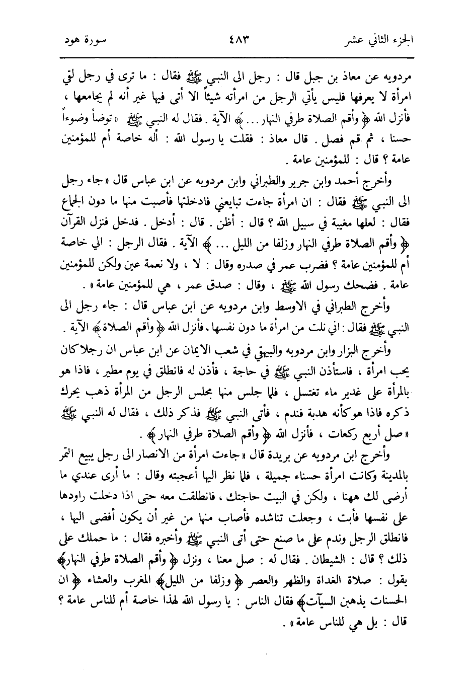 وَابْن مرْدَوَيْه عَن معَاذ بن جبل قَالَ: رجل إِلَى النَّبِي صلى الله عَلَيْهِ وَسلم فَقَالَ: مَا ترى فِي رجل لَقِي امْرَأَة لَا يعرفهَا فَلَيْسَ يَأْتِي الرجل من امْرَأَته شَيْئا إِلَّا أَتَى فِيهَا غير أَنه لم يُجَامِعهَا فَأنْزل الله {وأقم الصَّلَاة طرفِي النَّهَار} الْآيَة
