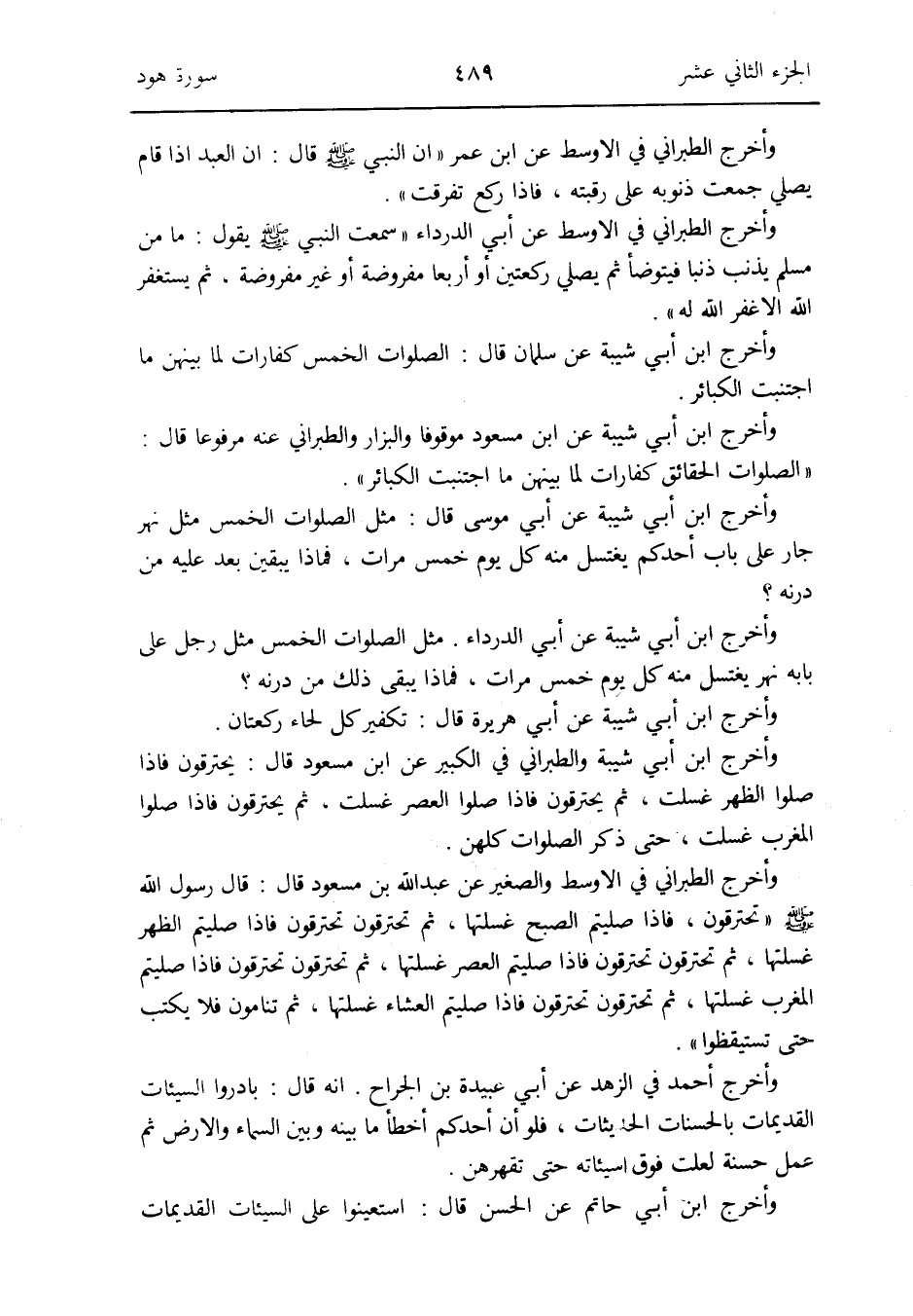 مثل الصَّلَوَات الْخمس مثل رجل على بَابه نهر يغْتَسل مِنْهُ كل يَوْم خمس مَرَّات فَمَاذَا يبقيي ذَلِك من درنه وَأخرج ابْن أبي شيبَة عَن أبي هُرَيْرَة قَالَ: تَكْفِير كل لحاء رَكْعَتَانِ