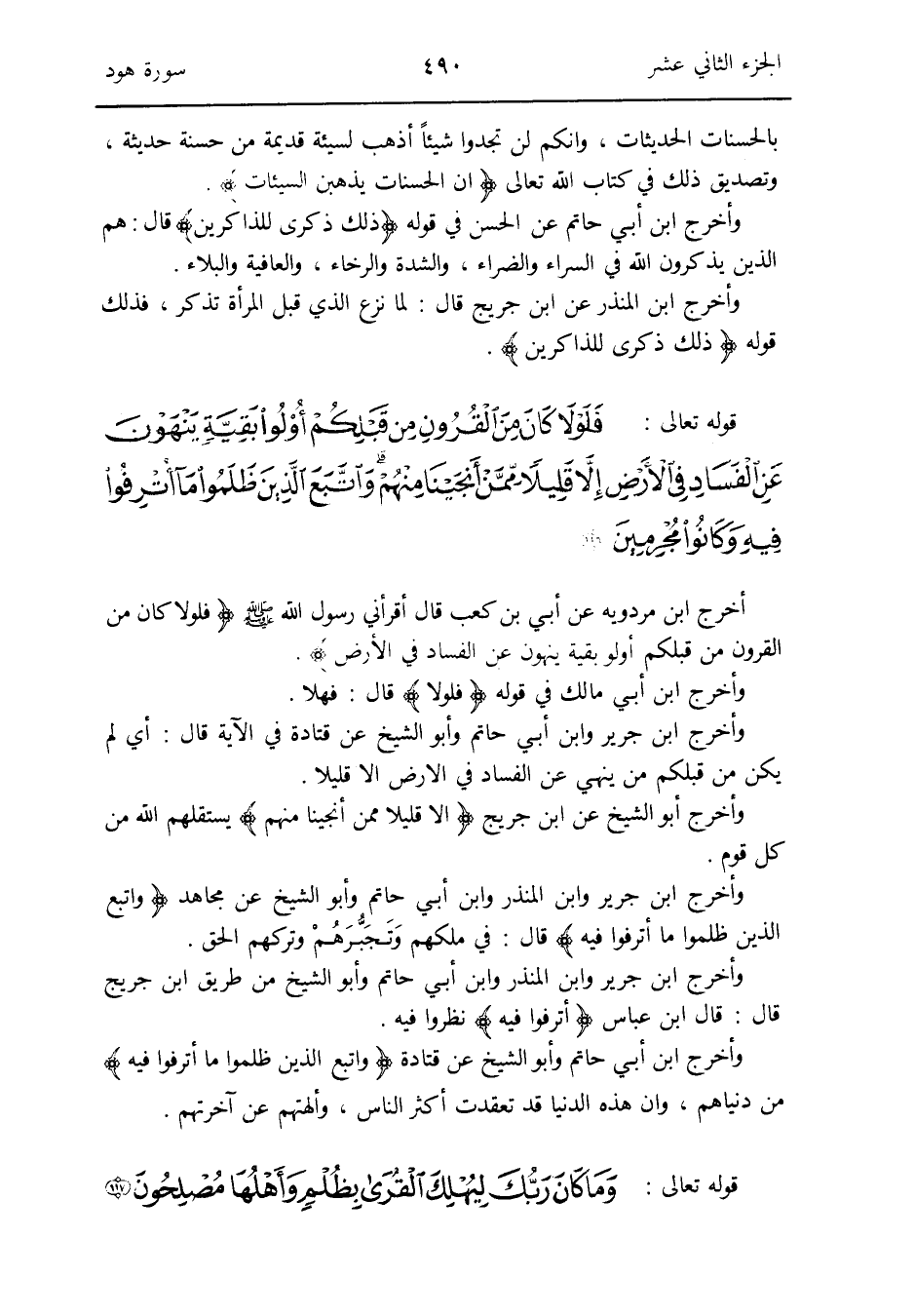 أخرج ابْن مرْدَوَيْه عَن أبي بن كَعْب قَالَ أَقْرَأَنِي رَسُول الله صلى الله عَلَيْهِ وَسلم {فلولا كَانَ من الْقُرُون من قبلكُمْ أولُوا بَقِيَّة ينهون عَن الْفساد فِي الأَرْض}