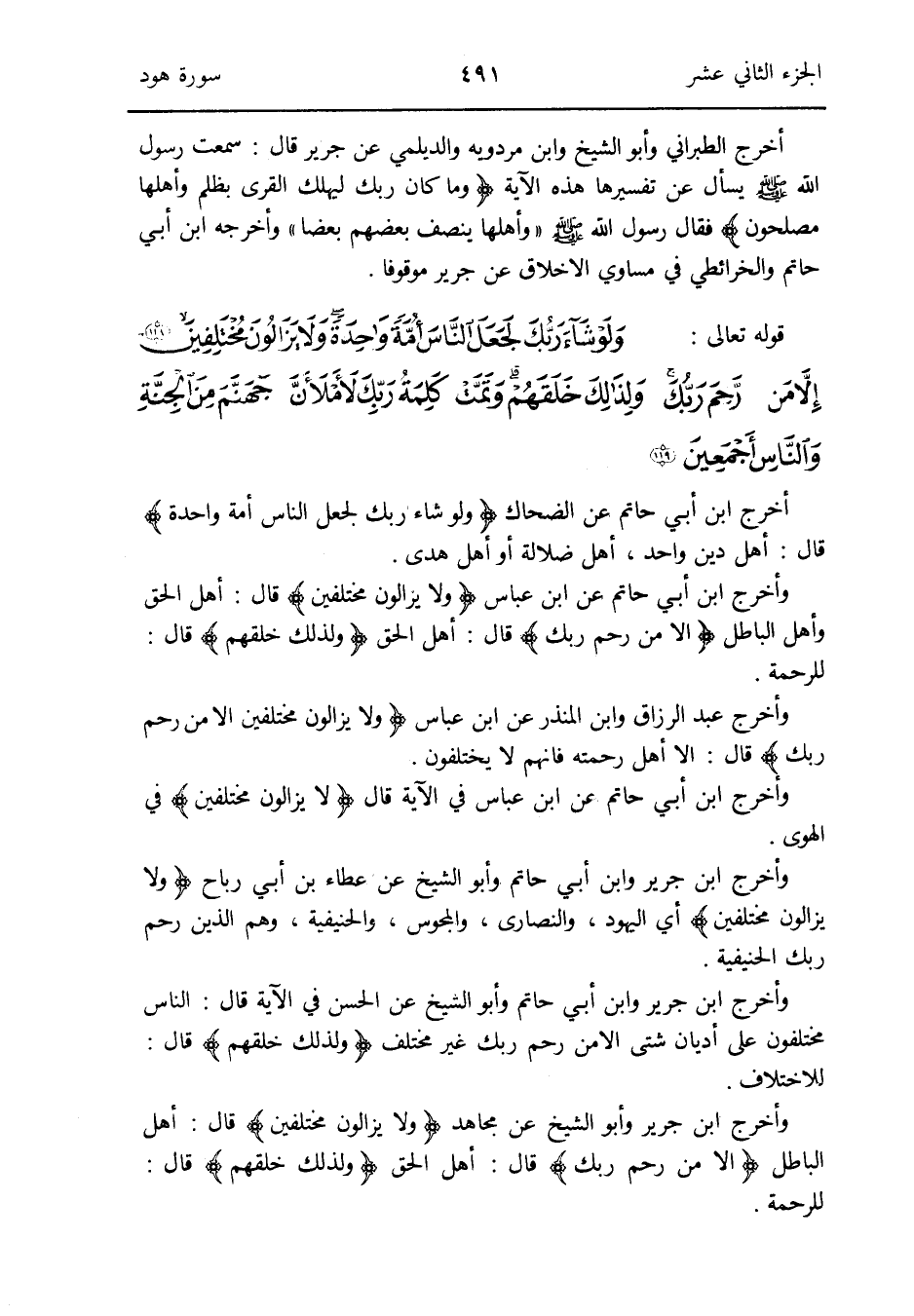وَأخرج عبد الرَّزَّاق وَابْن الْمُنْذر عَن ابْن عَبَّاس {وَلَا يزالون مُخْتَلفين إِلَّا من رحم رَبك} قَالَ: إِلَّا أهل رَحمته فَإِنَّهُم لَا يَخْتَلِفُونَ