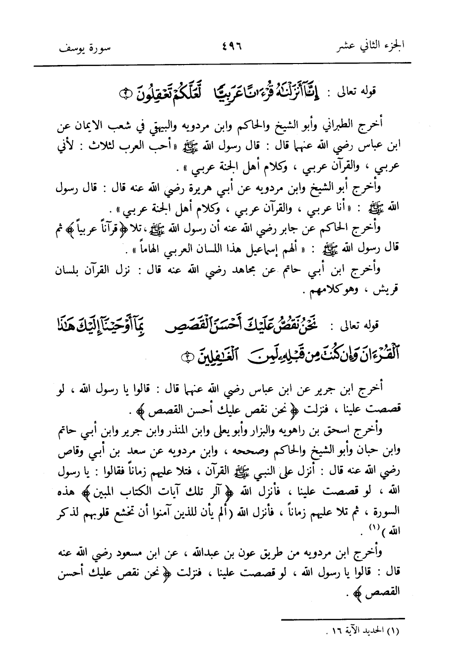 وَأخرج إِسْحَق بن رَاهَوَيْه وَالْبَزَّار وَأَبُو يعلى وَابْن الْمُنْذر وَابْن جرير وَابْن أبي حَاتِم وَابْن حبَان وَأَبُو الشَّيْخ وَالْحَاكِم وَصَححهُ وَابْن مرْدَوَيْه عَن سعد بن أبي وَقاص رَضِي الله عَنهُ قَالَ: أنزل على النَّبِي صلى الله عَلَيْهِ وَسلم الْقُرْآن فَتلا عَلَيْهِم زَمَانا فَقَالُوا: يَا رَسُول الله لَو قصصت علينا فَأنْزل الله {الر تِلْكَ آيَات الْكتاب الْمُبين} هَذِه السُّورَة ثمَّ تَلا عَلَيْهِم زَمَانا فَأنْزل الله (ألم يَأن للَّذين آمنُوا أَن تخشع قُلُوبهم لذكر الله) (الْحَدِيد الْآيَة 16)