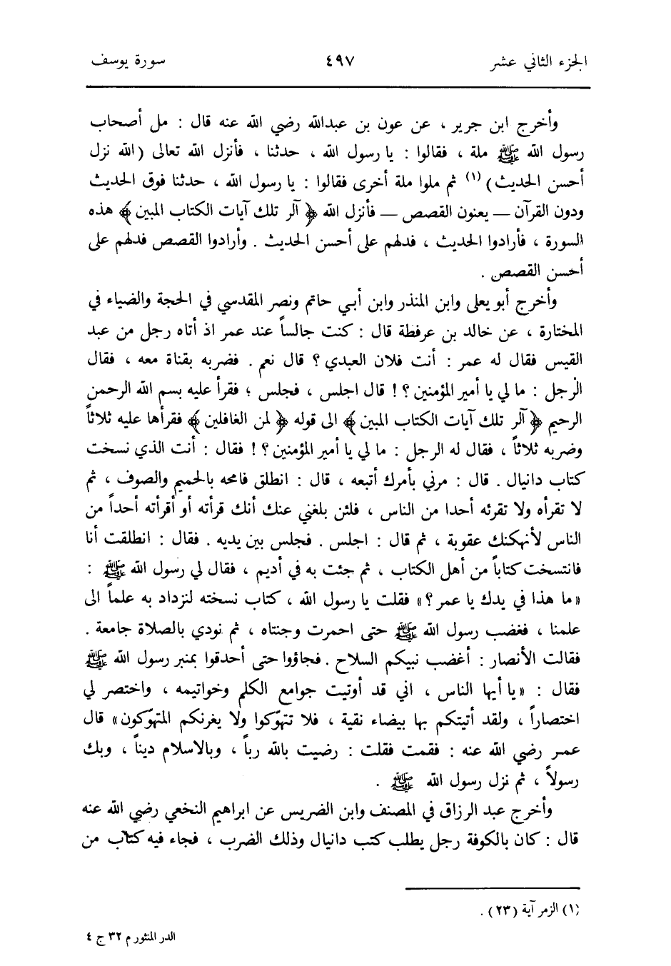 فَضَربهُ بقناة مَعَه فَقَالَ الرجل: مَا لي يَا أَمِير الْمُؤمنِينَ قَالَ اجْلِسْ فَجَلَسَ فَقَرَأَ عَلَيْهِ بِسم الله الرَّحْمَن الرَّحِيم {الر تِلْكَ آيَات الْكتاب الْمُبين} إِلَى قَوْله {لمن الغافلين} فقرأها عَلَيْهِ ثَلَاثًا وضربه ثَلَاثًا فَقَالَ لَهُ الرجل: مَا لي يَا أَمِير الْمُؤمنِينَ فَقَالَ: أَنْت الَّذِي نسخت كتاب دانيال