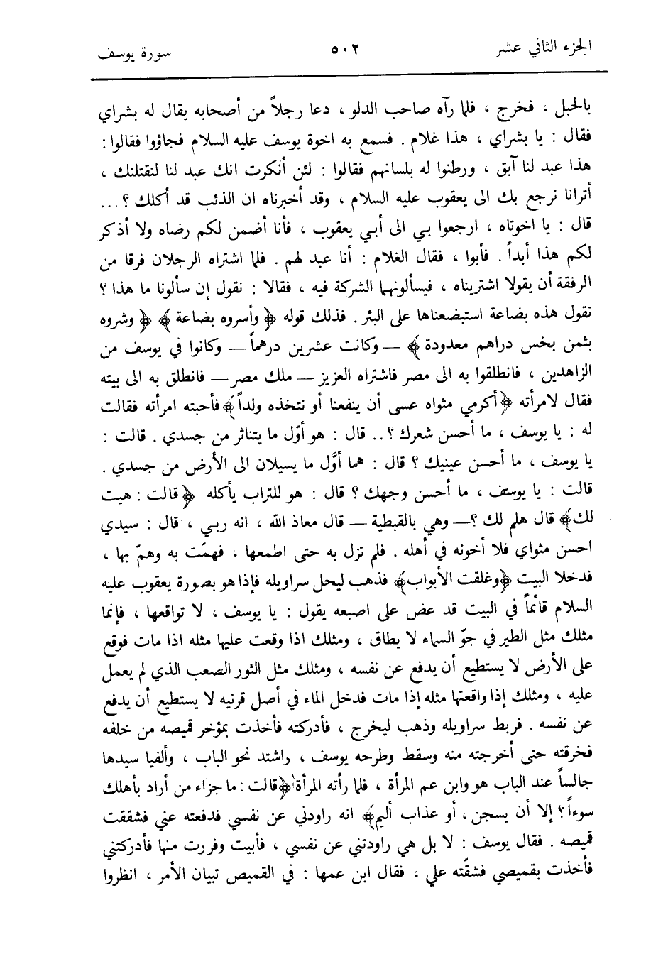 فَقَالَ يُوسُف: لَا بل هِيَ راودتني عَن نَفسِي فأبيت وفررت مِنْهَا فأدركتني فَأخذت بقميصي فشقته عَليّ