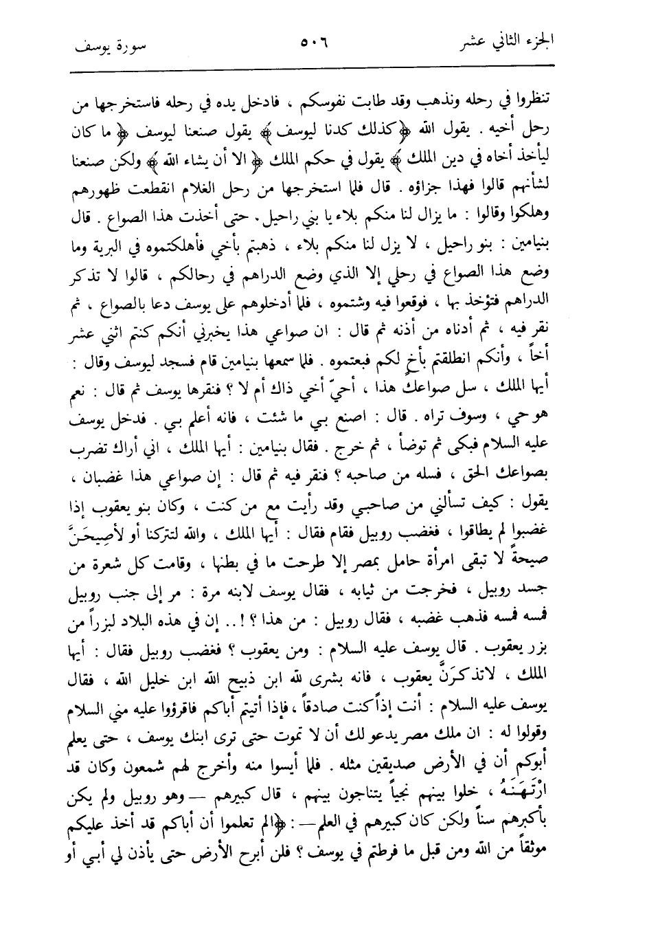 فَقَالَ بنيامين: أَيهَا الْملك إِنِّي أَرَاك تضرب بصواعك الْحق فسله من صَاحبه فَنقرَ فِيهِ ثمَّ قَالَ: إِن صواعي هَذَا غَضْبَان يَقُول: كَيفَ تَسْأَلنِي من صَاحِبي وَقد رَأَيْت مَعَ من كنت وَكَانَ بَنو يَعْقُوب إِذا غضبوا لم يطاقوا فَغَضب روبيل فَقَامَ فَقَالَ: أَيهَا الْملك وَالله لتتركنا أَو لأصِيحَنَّ صَيْحَة لَا تبقى امْرَأَة حَامِل بِمصْر إِلَّا طرحت مَا فِي بَطنهَا وَقَامَت كل شَعْرَة من جَسَد روبيل فَخرجت من ثِيَابه فَقَالَ يُوسُف لِابْنِهِ مرّة: مر إِلَى جنب روبيل فمسه فمسه فَذهب غَضَبه فَقَالَ روبيل: من هَذَا