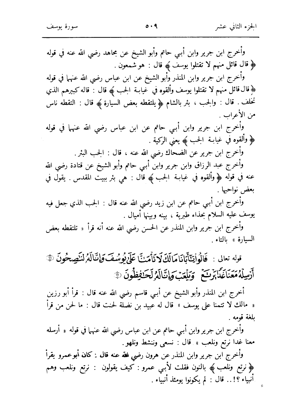 وَأخرج ابْن جرير وَابْن أبي حَاتِم عَن ابْن عَبَّاس رَضِي الله عَنْهُمَا فِي قَوْله {وألقوه فِي غيابة الْجب} يَعْنِي الرَّكية