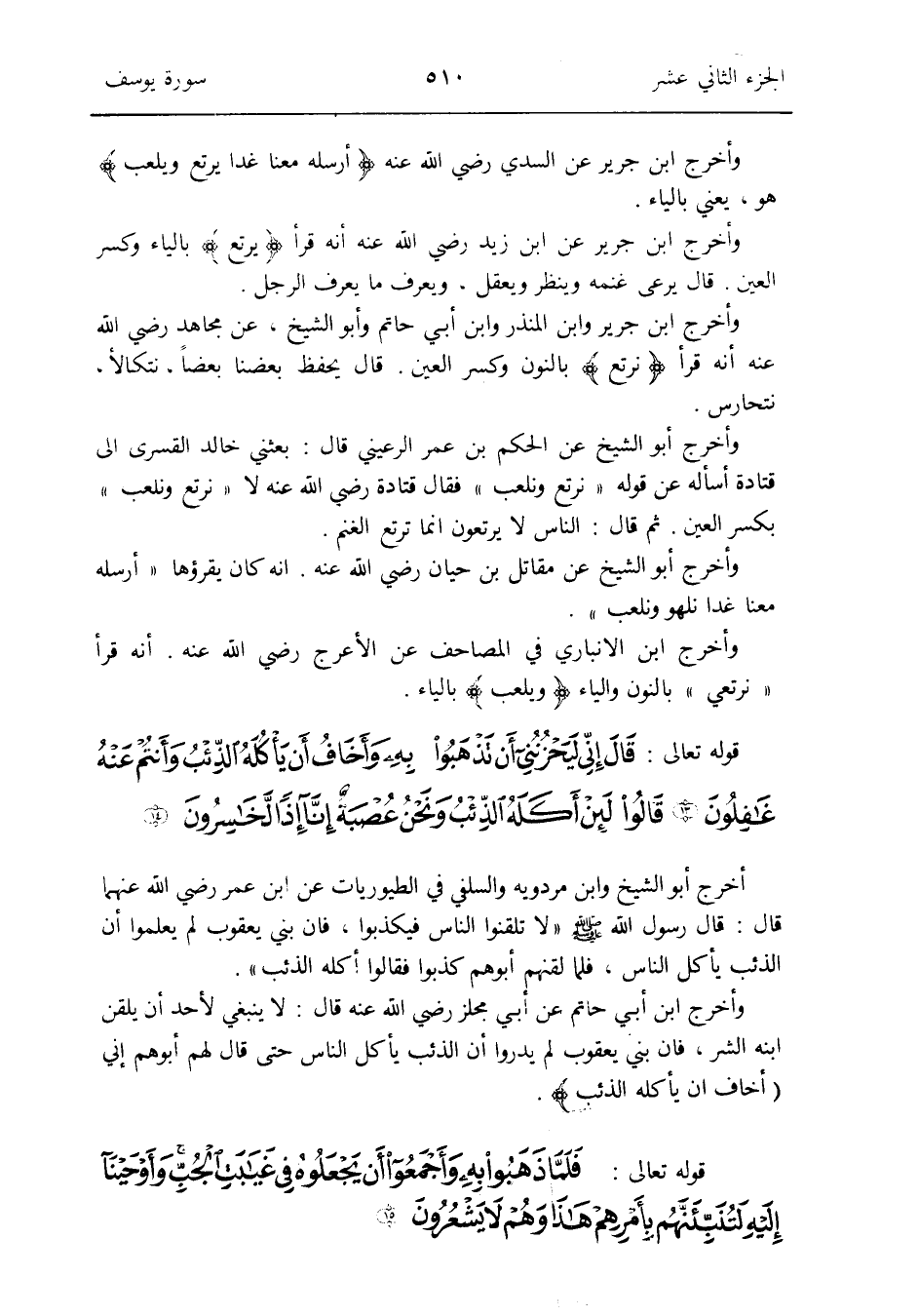 وَأخرج ابْن جرير عَن السّديّ رَضِي الله عَنهُ {أرْسلهُ مَعنا غَدا يرتع ويلعب} هُوَ يَعْنِي بِالْيَاءِ