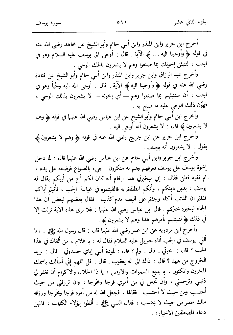 وَأخرج ابْن مرْدَوَيْه عَن ابْن عمر رَضِي الله عَنْهُمَا قَالَ: قَالَ رَسُول الله صلى الله عَلَيْهِ وَسلم: لما ألقِي يُوسُف فِي الْجب أَتَاهُ جِبْرِيل عَلَيْهِ السَّلَام فَقَالَ لَهُ: يَا غُلَام من أَلْقَاك فِي هَذَا الْجب قَالَ: إخوتي