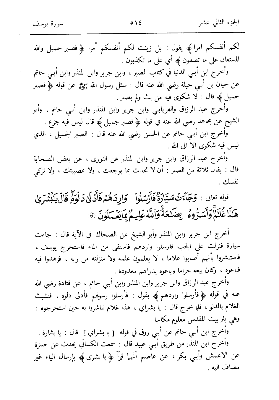 وَأخرج عبد الرَّزَّاق وَابْن جرير وَابْن الْمُنْذر وَابْن أبي حَاتِم عَن قَتَادَة رَضِي الله عَنهُ فِي قَوْله {فأرسلوا واردهم} يَقُول: فأرسلوا رسولهم فأدلى دلوه فتشبث الْغُلَام بالدلو فَلَمَّا خرج قَالَ: يَا بشراي هَذَا غُلَام تباشروا بِهِ حِين استخرجوه: وَهِي بِئْر بِبَيْت الْمُقَدّس مَعْلُوم مَكَانهَا