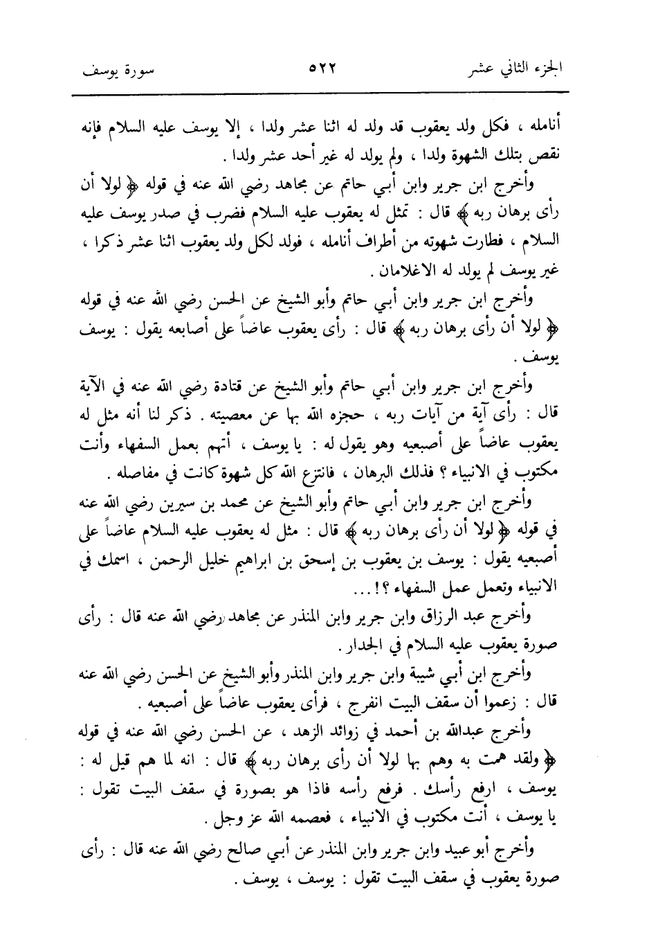 وَأخرج ابْن جرير وَابْن أبي حَاتِم وَأَبُو الشَّيْخ عَن الْحسن رَضِي الله عَنهُ فِي قَوْله {لَوْلَا أَن رأى برهَان ربه} قَالَ: رأى يَعْقُوب عاضاً على أَصَابِعه يَقُول: يُوسُف يُوسُف
