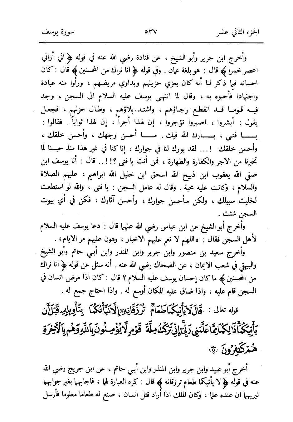 أَنه سُئِلَ عَن قَوْله {إِنَّا نرَاك من الْمُحْسِنِينَ} مَا كَانَ إِحْسَان يُوسُف عَلَيْهِ السَّلَام قَالَ: كَانَ إِذا مرض إِنْسَان فِي السجْن قَامَ عَلَيْهِ وَإِذا ضَاقَ عَلَيْهِ الْمَكَان أوسع لَهُ
